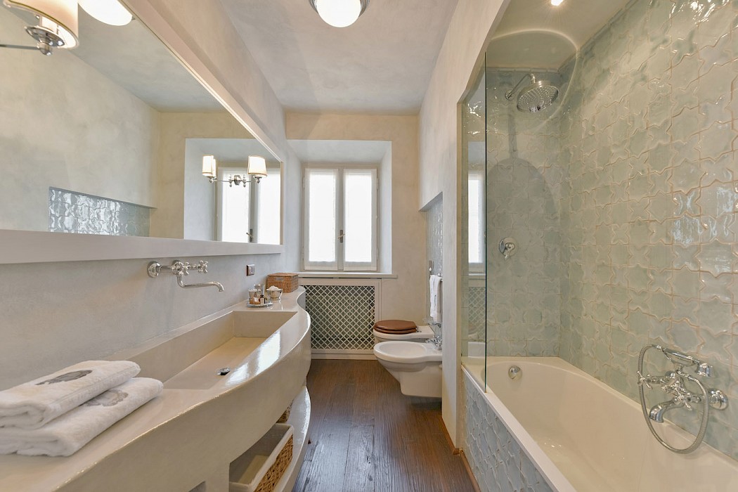 Spacious living room with fireplace. Elegant dining room. Small, fully-equipped kitchen. Study corner with desk. Sitting room with plasma, satellite TV. 1 master queen suite with private bathroom with tub and shower stall. Private suite with 1 twin bedroom, TV room with 1 single bed and en suite bathroom with shower. 1 twin bedroom and 1 queen bedroom (bed size 1.50 cm/200 cm) share a bathroom with shower.