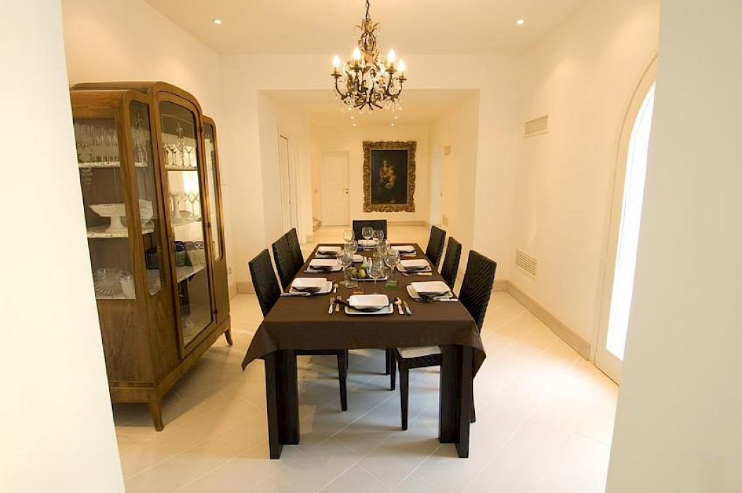 Expansive living room with fireplace and satellite flat screen TV, wide glass doors opening onto the furnished terrace, separate dining room adjacent to fully equipped kitchen with direct access to the terrace – perfect for serving meals al fresco. There is access to the swimming pool from both floors. The entire property features air conditioning throughout.