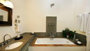 Twin bedroom; ensuite bathroom with tub and wall mounted shower