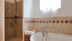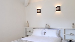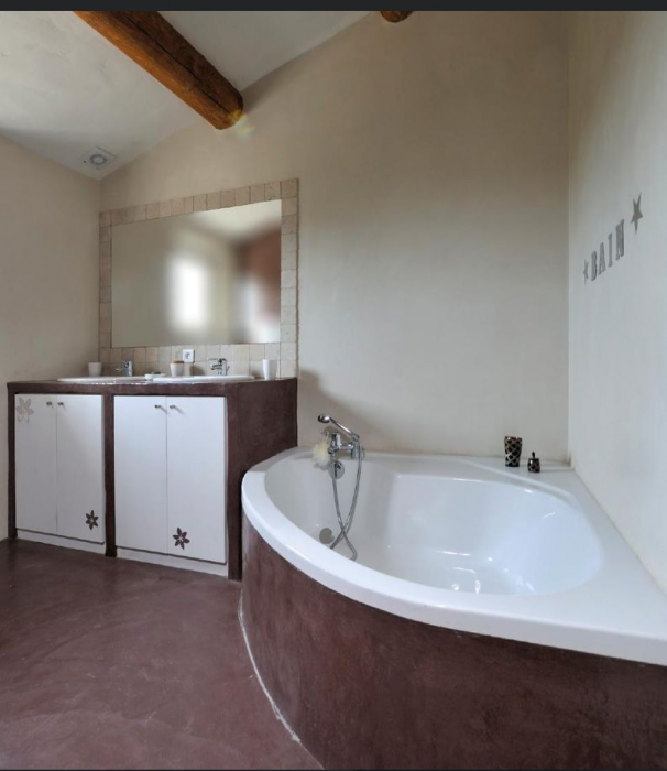 From the entrance, a rounded corridor leads you into the beautiful living area which includes an open-plan, fully-equipped kitchen, the dining room and the lounge, with a very beautiful fireplace. Here the light is the star of the show, with large French windows opening out onto a terrace. From there, the Provençal sun shines through and the Alpilles melt into the background. Two bedrooms: the master bedroom which has a magnificent walk-in closet, as well as a separate bedroom on the other side of the patio. Each bedroom has its own private bathroom and direct access to the terrace. An office, library and also a gym