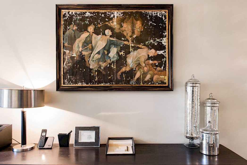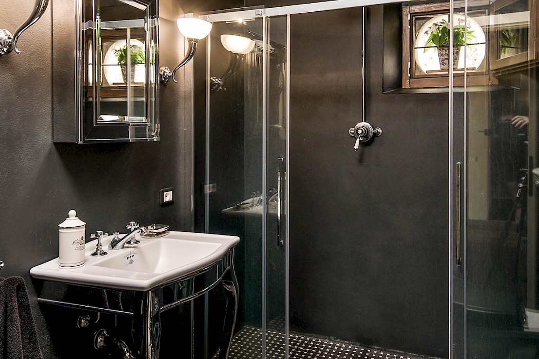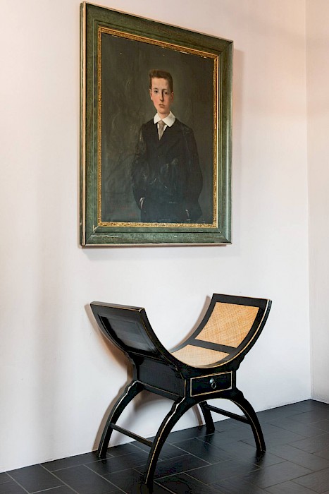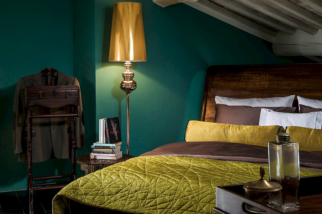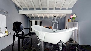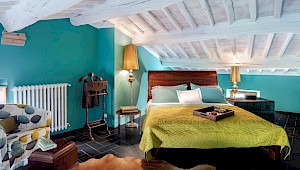 Continue up the staircase to the Mansard/ Attic. Enter into the room onto a small hallway and a large bathroom with tub. Continue down the short hallway to the spacious room with King bed and a small seating area. Please note that this room is located in the Mansarda or Attic and the ceilings slope at the perimeters.