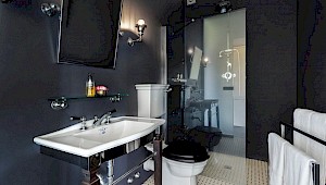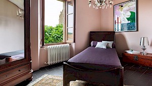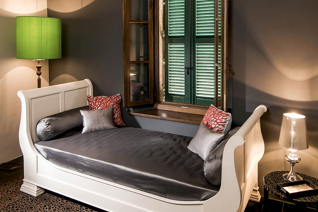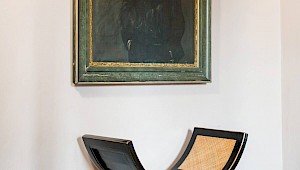 From the central hallway, a majestic stone staircase takes you up to a landing with window overlooking the gardens, continue up and you arrive at a seating area with a desk and printer and a comfortable chair for reading or relaxing. Off of this seating area are two Queen bedrooms, one on each side of the hallway and mirror images of each other. Both bedrooms have two entrances. The first door opens to a small hallway - in front of you is the large bathroom with walk in shower, a door leads to the front of the house where you have a Queen bedroom that also has another door leading directly to the seating area. Facing the garden is a dressing room with daybed. On request, the daybeds can accommodate one person but note that while there are doors from the hallway and to the bedroom, there are no doors for the dressing room.