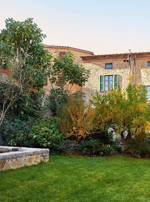 While the front door takes you right onto a pleasant little piazza, the rear door leads you to a private and tranquil garden which is meticulously planted with cypress trees, a pomegranate tree and particular flowers chosen for their scent and color. Here in the garden you will find a small plunge pool (11.5 feet x 8.5 feet x 3 feet deep), as well as lounge chairs on the main terrace with views of the garden, perfect for sipping a glass of Brunello di Montalcino. From the terrace, an immediate left will take you to a covered storage area and beyond that the small terrace that leads to the dining room. From the main terrace, four short steps takes you to the luscious green lawn surrounded by shrubbery and a small plunging pool , a walkway to the left has a staircase that leads you to the basements laundry room.