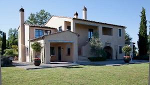 - Property spectacularly landscaped with shrubs, greenery, olive trees, and tall cypress trees