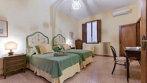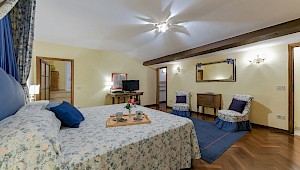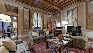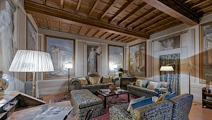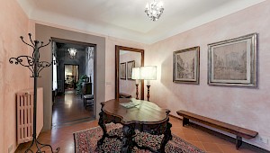 Located on the second floor of one of the most historic palazzo's in Florence, this unique apartment is a combination of two 3 bedroom units which interconnect. There are two very beautifully furnished sitting rooms and six bedrooms with six bathrooms (one of which is a guest bathroom). One of the two master bedrooms is on its own level and very private. Another bedroom is a single.