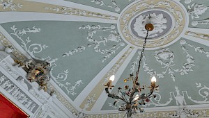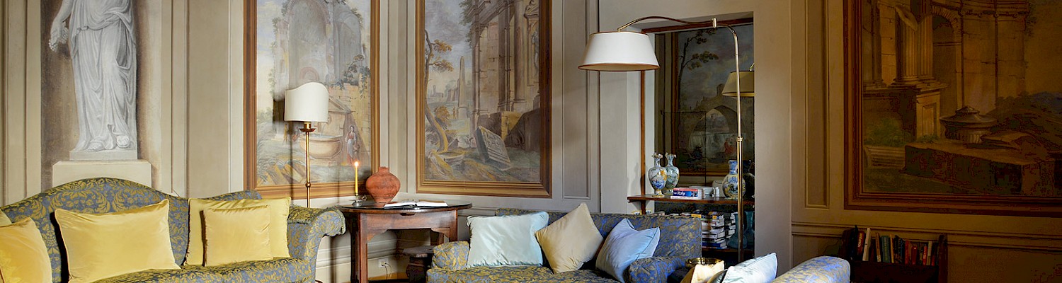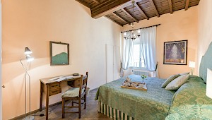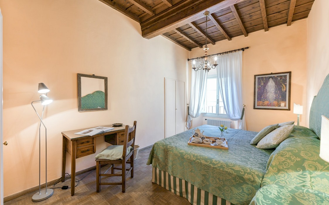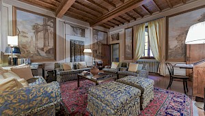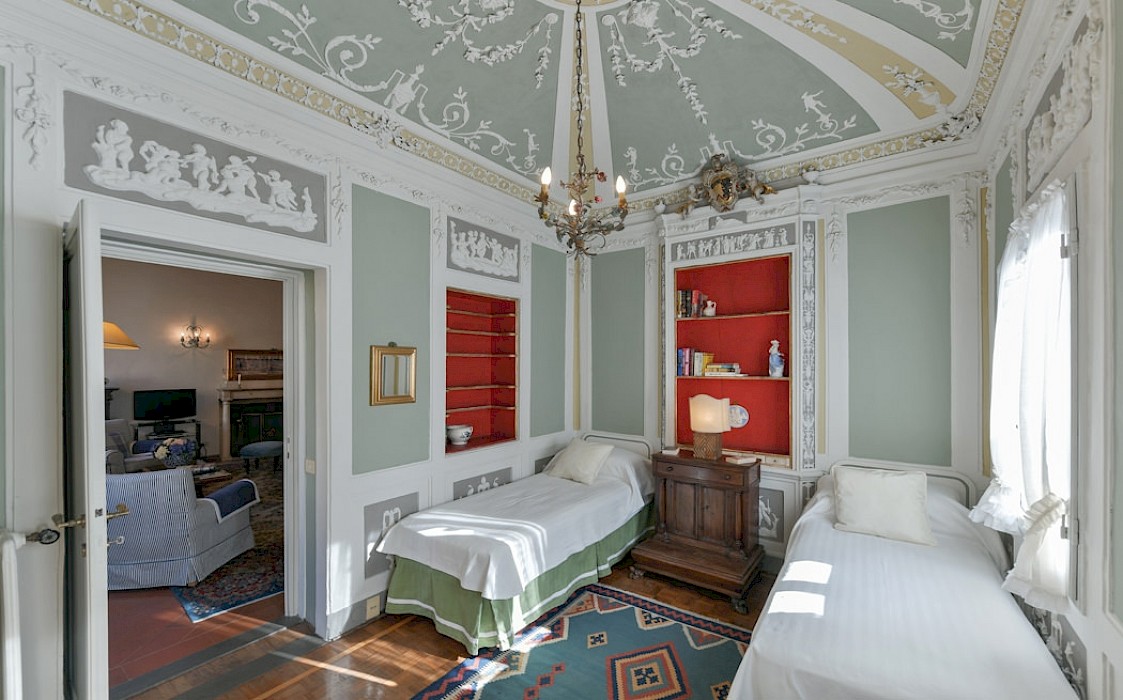 The bedroom is decorated with unique and historic plasterwork and frescoes dating from the eighteeenth century. Much of the apartment overlooks a private renaissance garden.