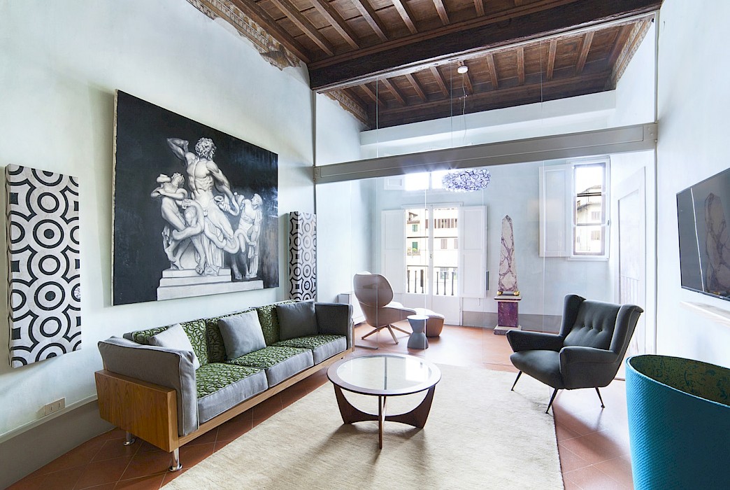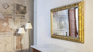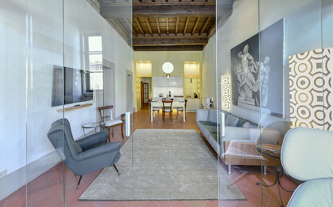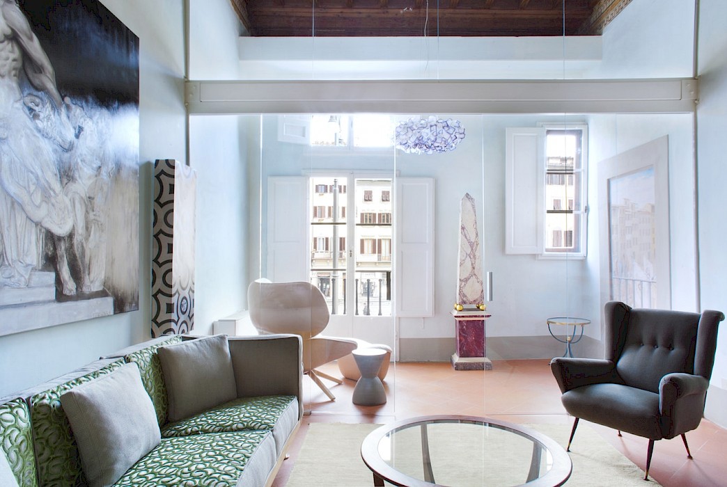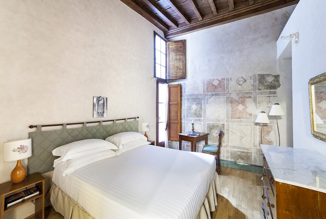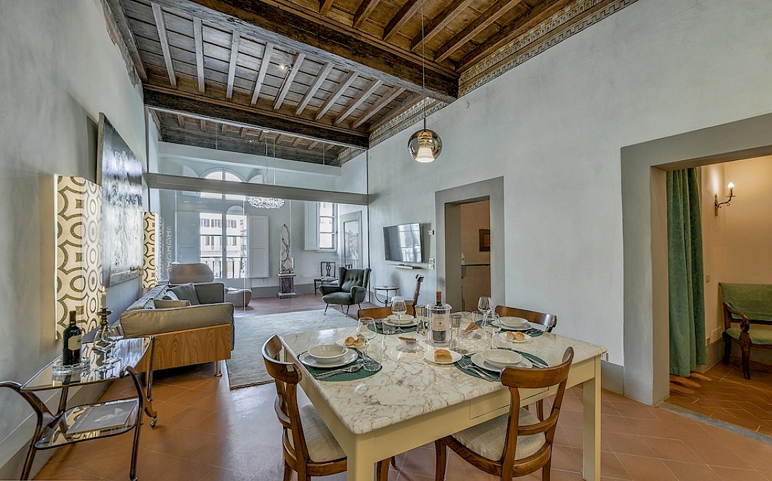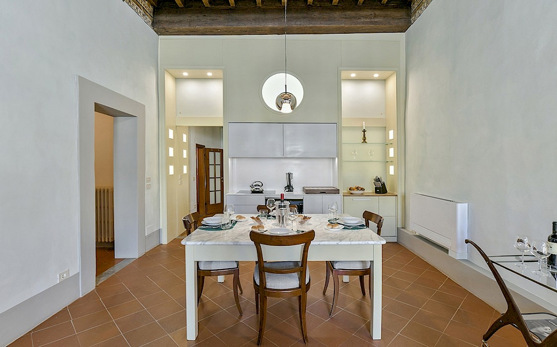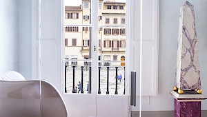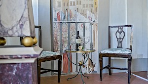 Despite their traditional tiled floors and beamed ceilings, this home’s pastel-painted living areas are largely contemporary in style, with some very striking design pieces and artworks. The master bedroom, with its frescoes and antiques, is contrastingly classic – but for its bold scarlet ensuite bathroom. Situated directly on Piazza Sante Croce in one of the most hoistoric Palazzos in the city, owned by a prominent noble family. It is also not far from the Piazza della Signoria, around which you’ll find many shops and restaurants.