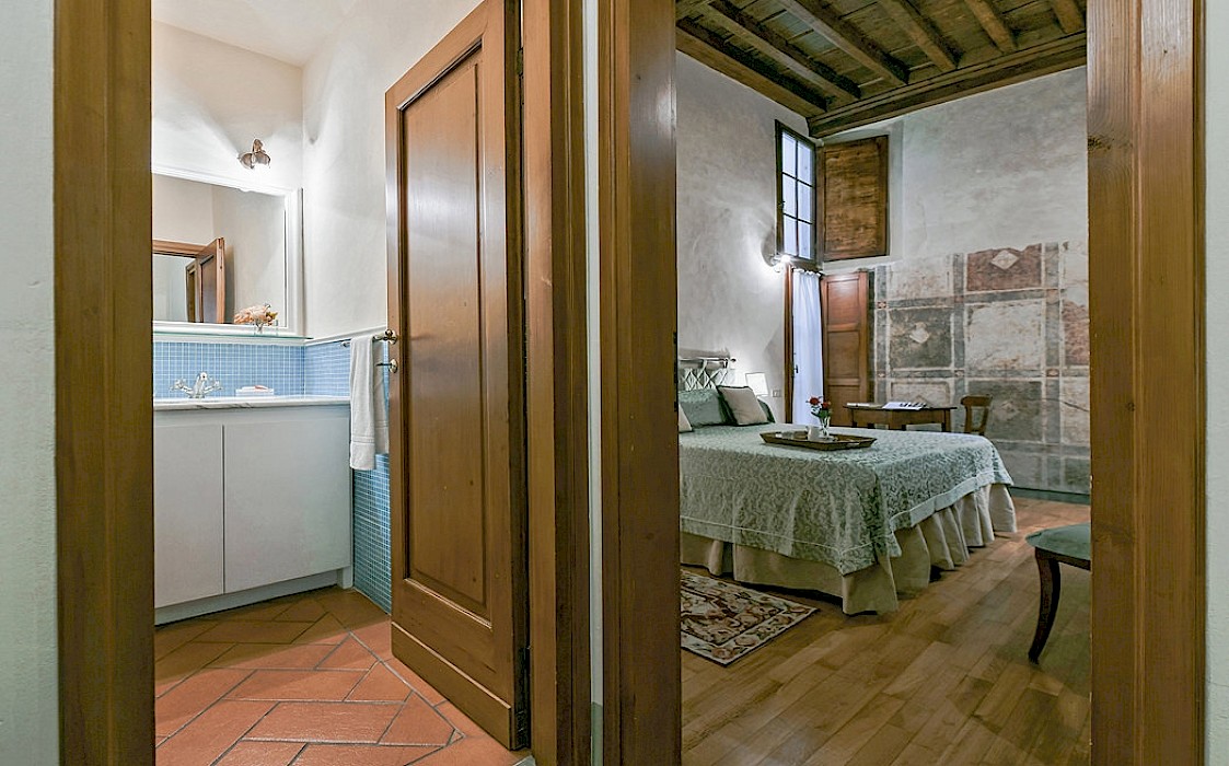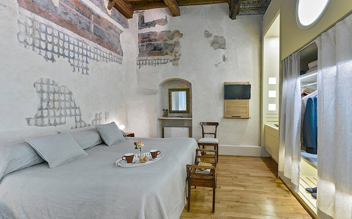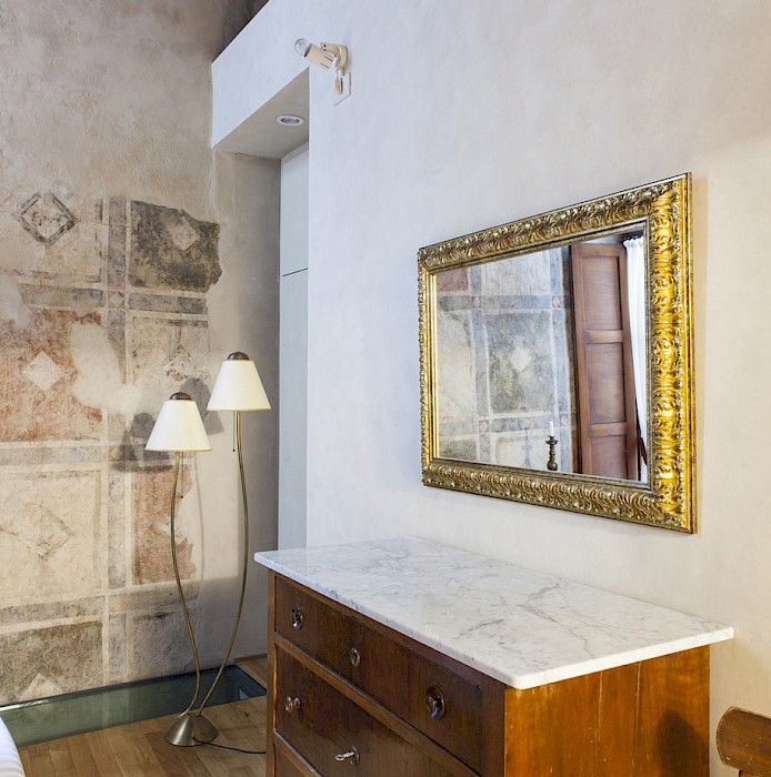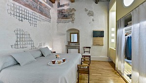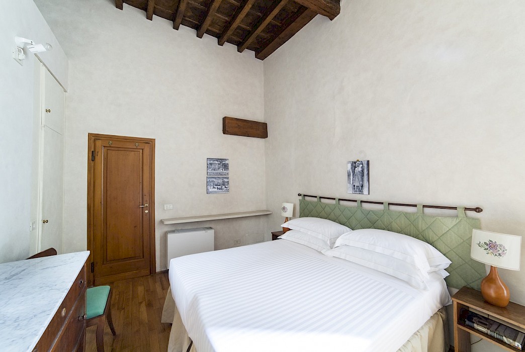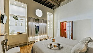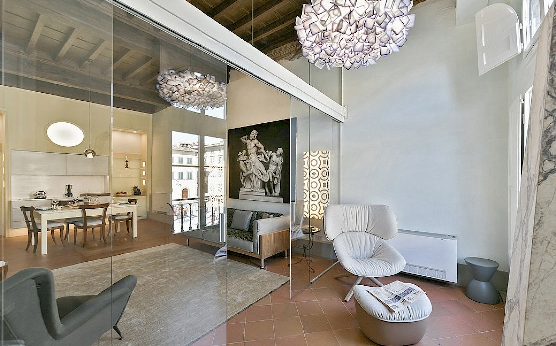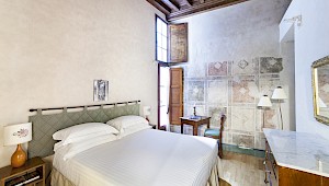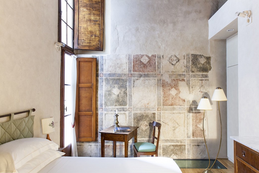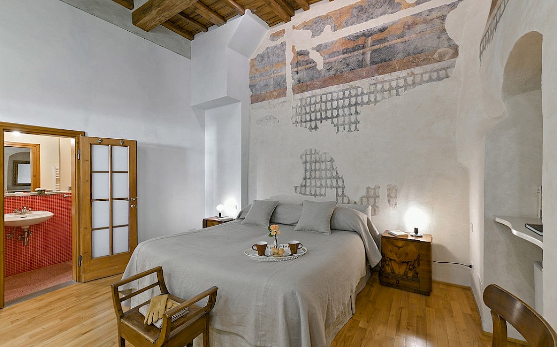 Despite their traditional tiled floors and beamed ceilings, this home’s pastel-painted living areas are largely contemporary in style, with some very striking design pieces and artworks. The master bedroom, with its frescoes and antiques, is contrastingly classic – but for its bold scarlet ensuite bathroom. Situated directly on Piazza Sante Croce in one of the most hoistoric Palazzos in the city, owned by a prominent noble family. It is also not far from the Piazza della Signoria, around which you’ll find many shops and restaurants.