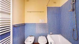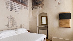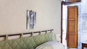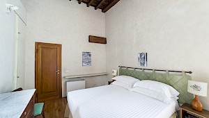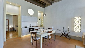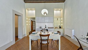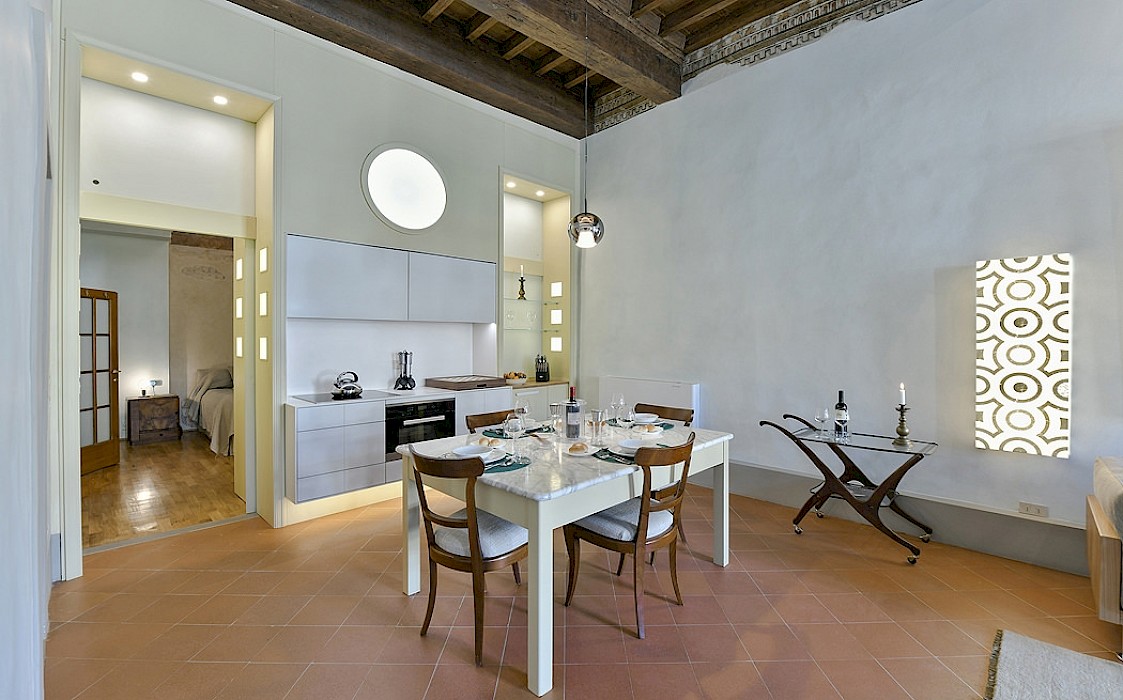 The home is located on the second floor of the Palazzo, 25 steps up from main entrance or 28 down from elevator landing, the apartment offers a spacious living/dining room with decorative original wood beam ceilings and portions of medieval wall paintings. The fully-equipped cooking area opens into the living and dining areas with french windows overlooking the Piazza Santa Croce. Highly Reccommended.