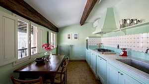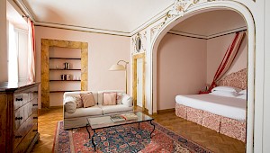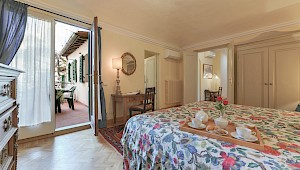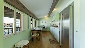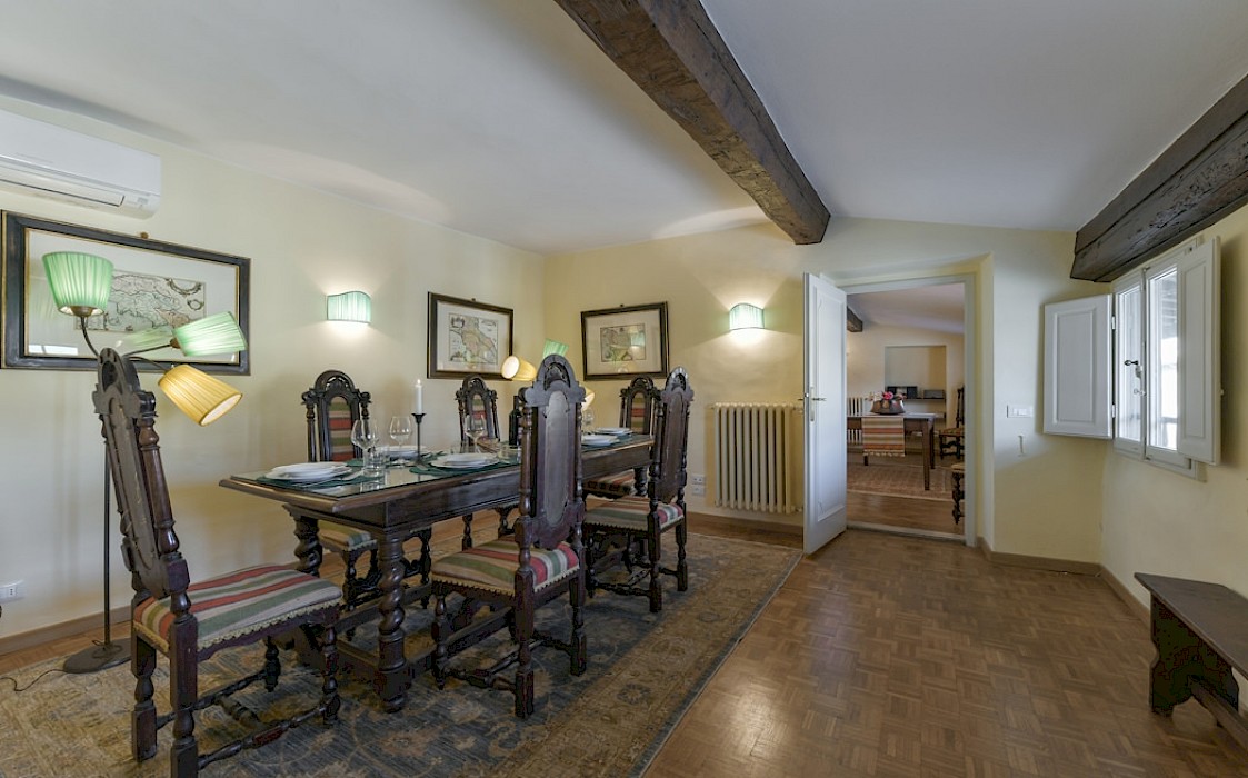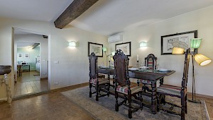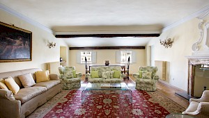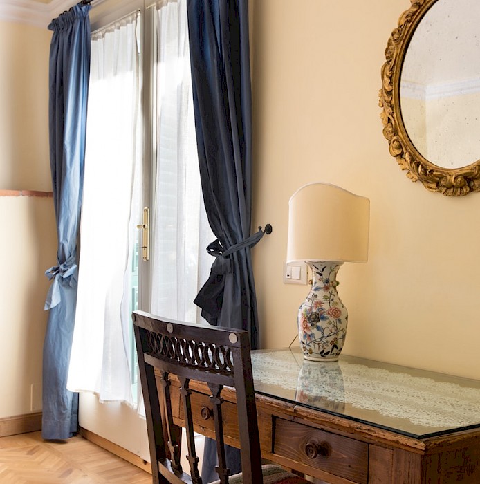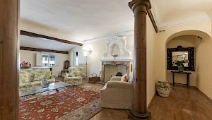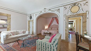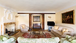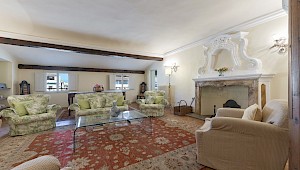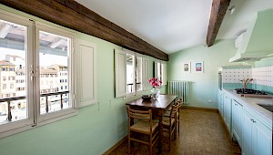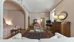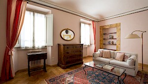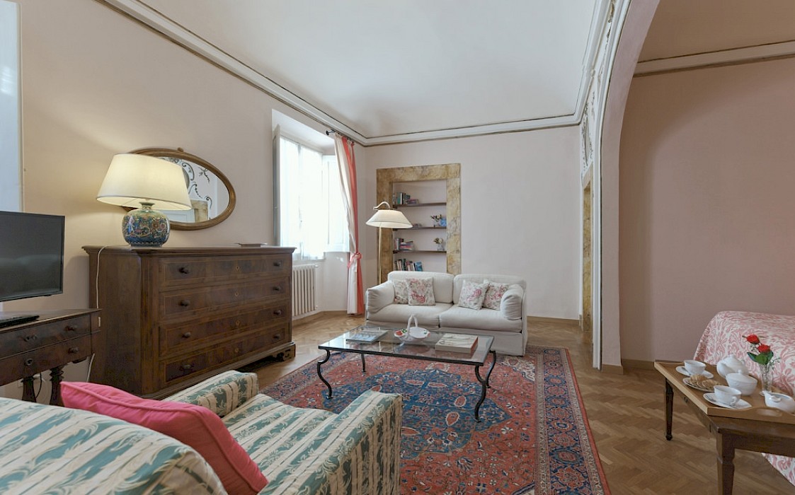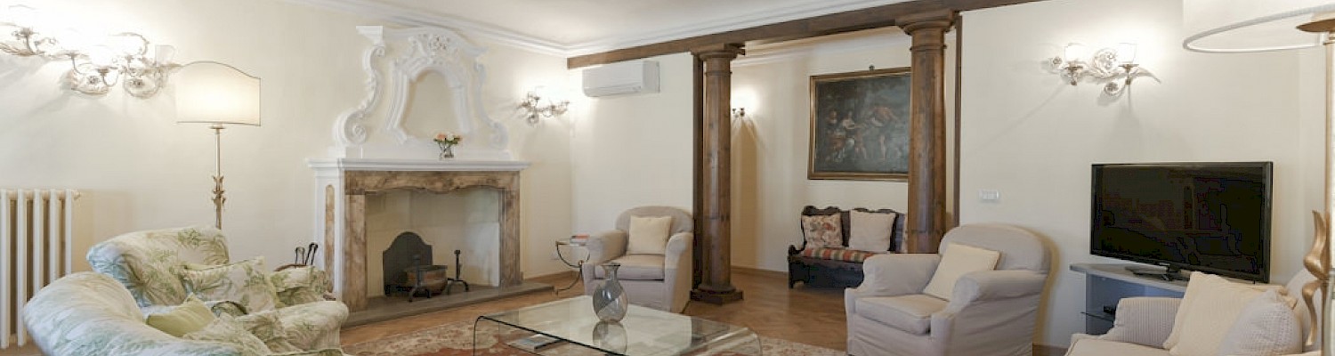 Right on Piazza Santa Croce on the quiet third floor of an historic palazzo, just off the elevator, all three bedrooms in this apartment overlook inner courtyards, one with a private terrace. The elegant and spacious living room, with working fireplace, overlooks the square of Piazza Santa Croce, as does the separate dining room, with seating for 8 to 10 guests.