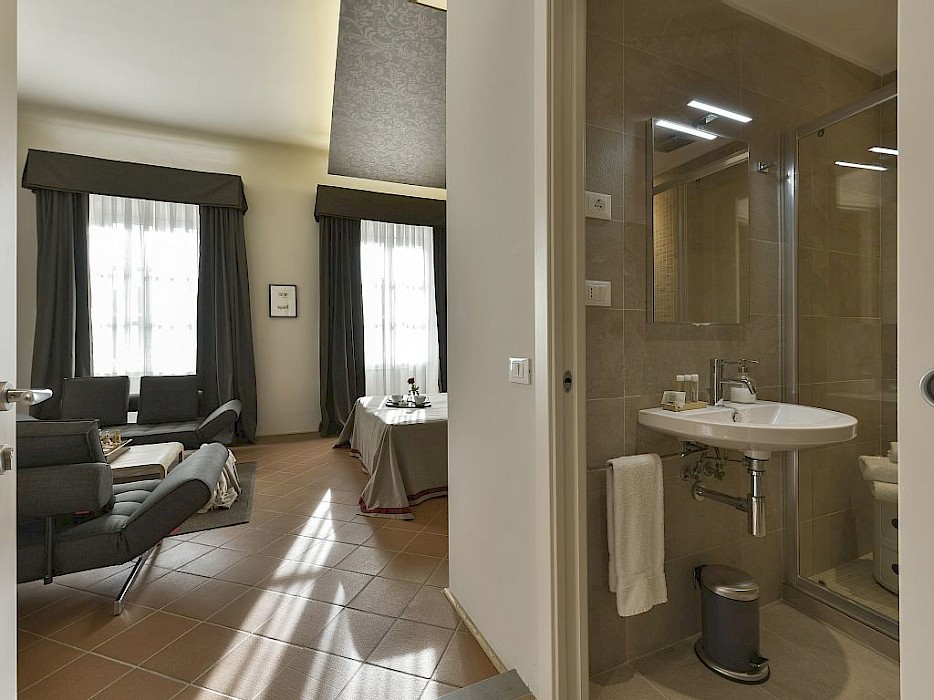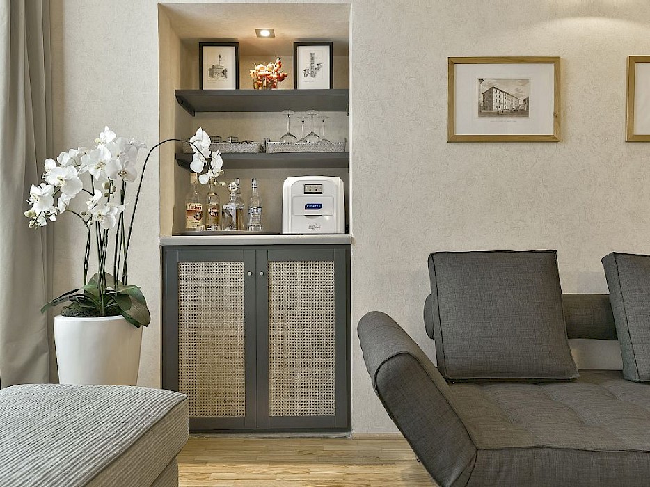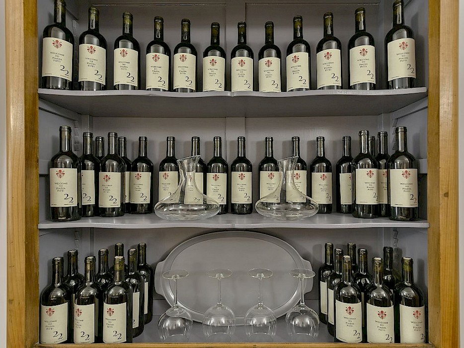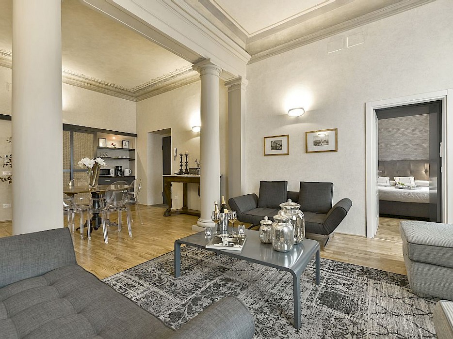 The apartment is composed of one main living room that boasts magnificent frescoes on the ceiling and original columns which date back to the 17th Century when the building was first constructed as a theatre. The windows in this room, as well as the other 4 front facing windows of the flat, offer splendid views directly onto the impressive Palazzo Pitti, the home of the Medici family during Renaissance times. The living room is well equipped and offers two bars area : one for preparing hot drinks and the other for making cocktails as there is a small fridge and ice machine .