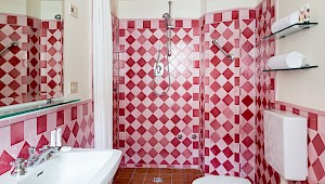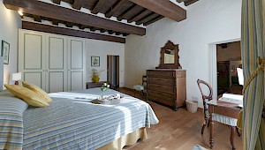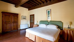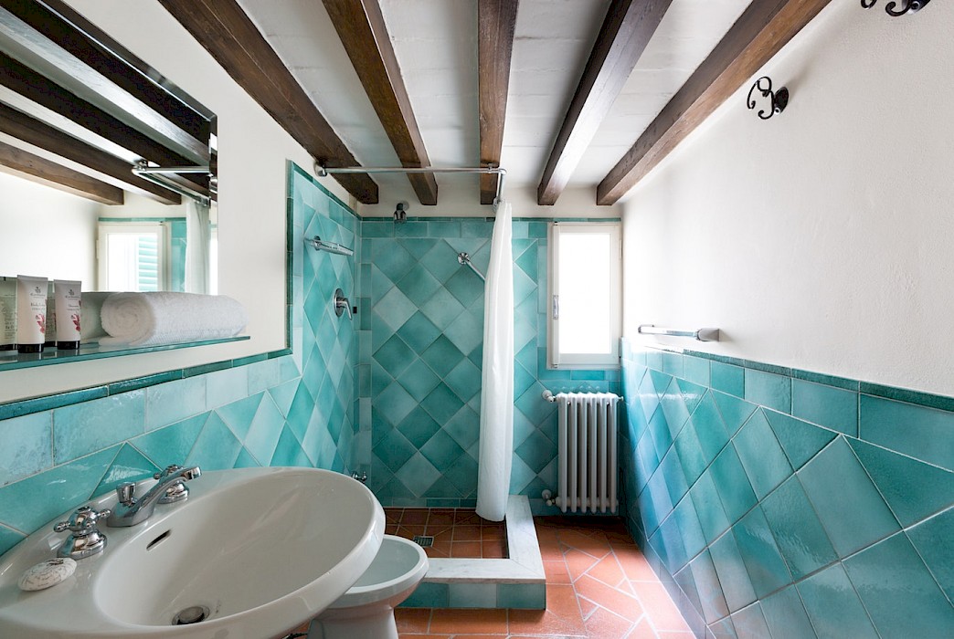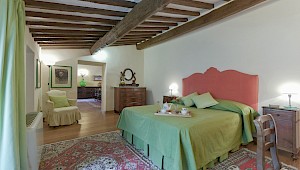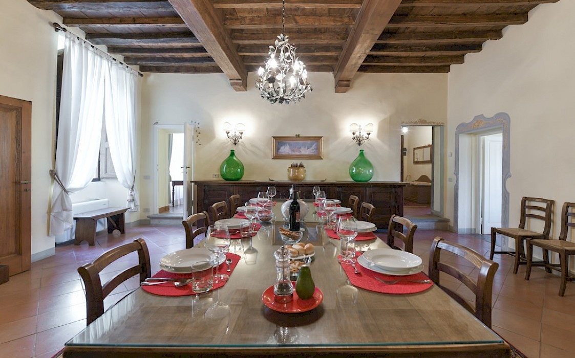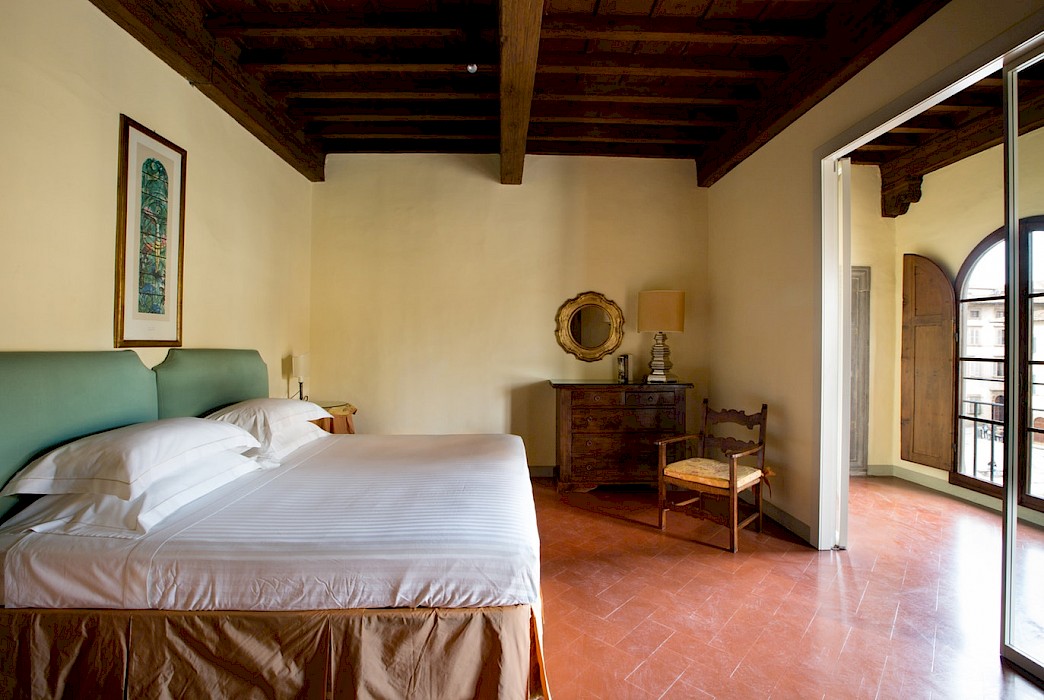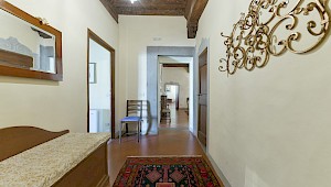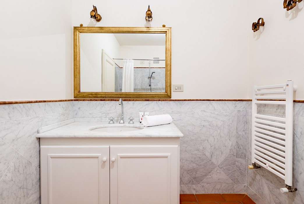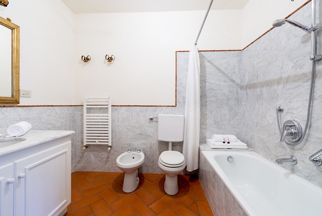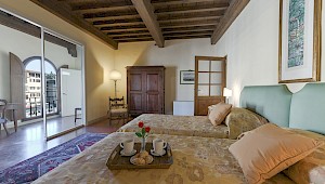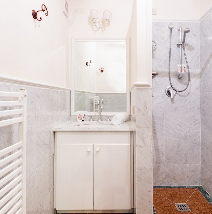 Apartment on one level in classical Florentine style (235 sq.mt - 2529 sq.ft), can host up to 6+1 people and offers 3 bedrooms and 4 full bathrooms. At the entrance a corridor leads on the right to the first bedroom with double bed(mattress 160 cm - can be divided) which has ensuite bathroom and direct access to the dining room. On the left in the corridor is the second bedroom with two single beds (mattress 90 cm - can be joined together) with double glazing windows overlooking the Square. Follows the dining room furnished with 12 seater table; here there is a door which leads to a small hall with direct access to the first and the second bathrooms: the first one has both bathtube and shower stall, the second bathroom has a shower with curtain. There is also a small laundry room.