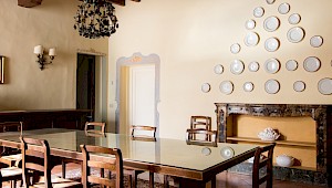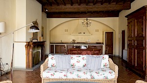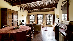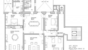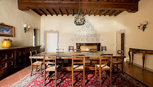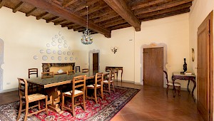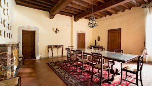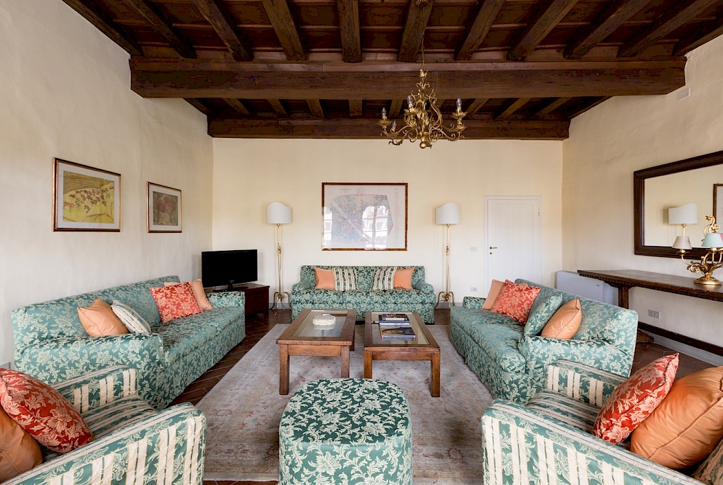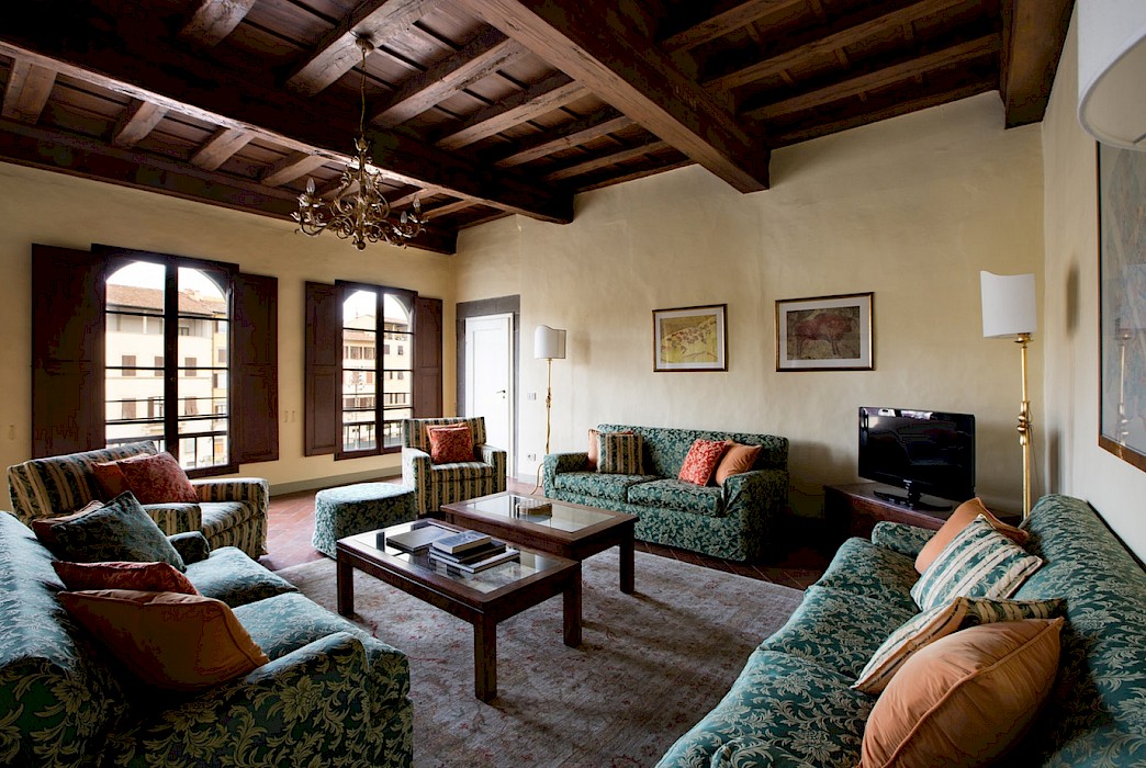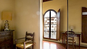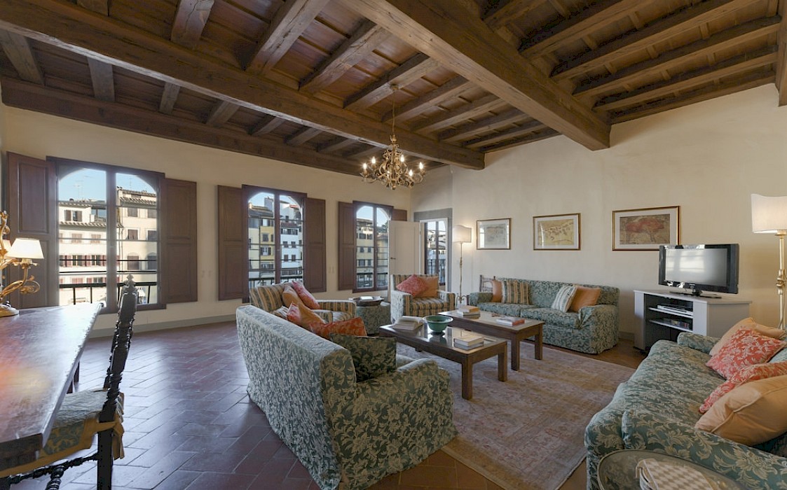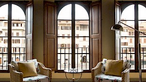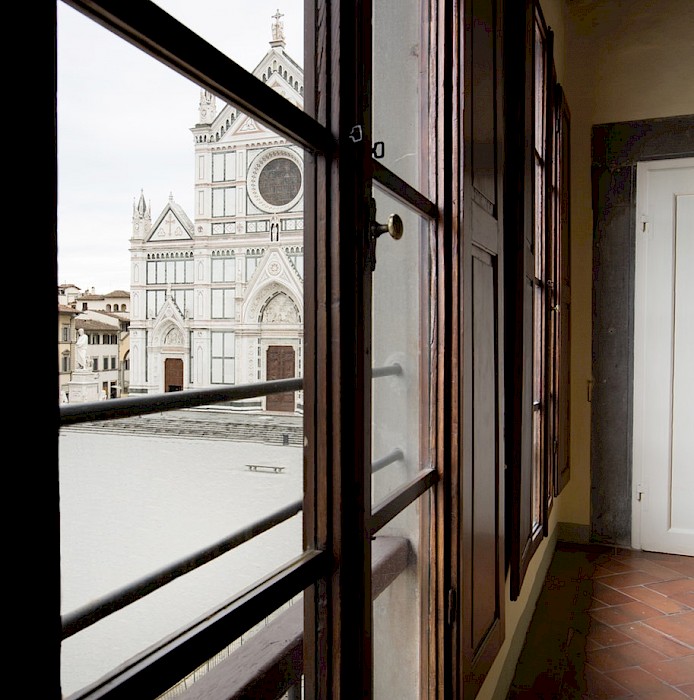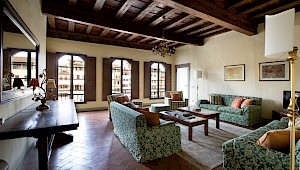 Entertain, relax, work and live on the majestic second floor of the palazzo, directly overlooking Piazza Santa Croce.. This elevator-accessible apartment boasts eight enormous floor-to-ceiling windows overlooking Piazza Santa Croce. The elegant and spacious living room opens into a fully equipped eat-in kitchen with working fireplace and room for eight; while the separate, formal dining room can seat up to twelve guests. Bedrooms lay behind a glass door with stunning views of the Piazza.
