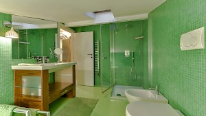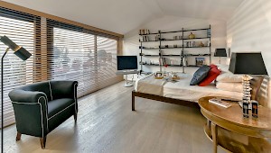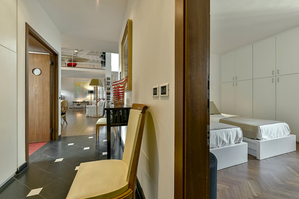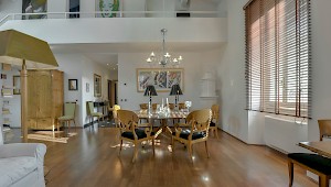 The inviting living room features comfortable sofas, beautiful antiques as well as modern design furniture, high wood beamed ceiling, and three large windows that allow in the natural city light. While the living room is designed with easy care in mind, the dining area is completed with Biedermeier style upholstered chairs and table that give the space a more formal look. The hardwood floors, the internal staircase and the contemporary art on the walls add warmth and interest to the apartment. A fully equipped modern eat-in kitchen and the laundry room complete this floor. 1 twin bedroom with a/c, flat screen TV and DVD, and en-suite bathroom with shower