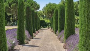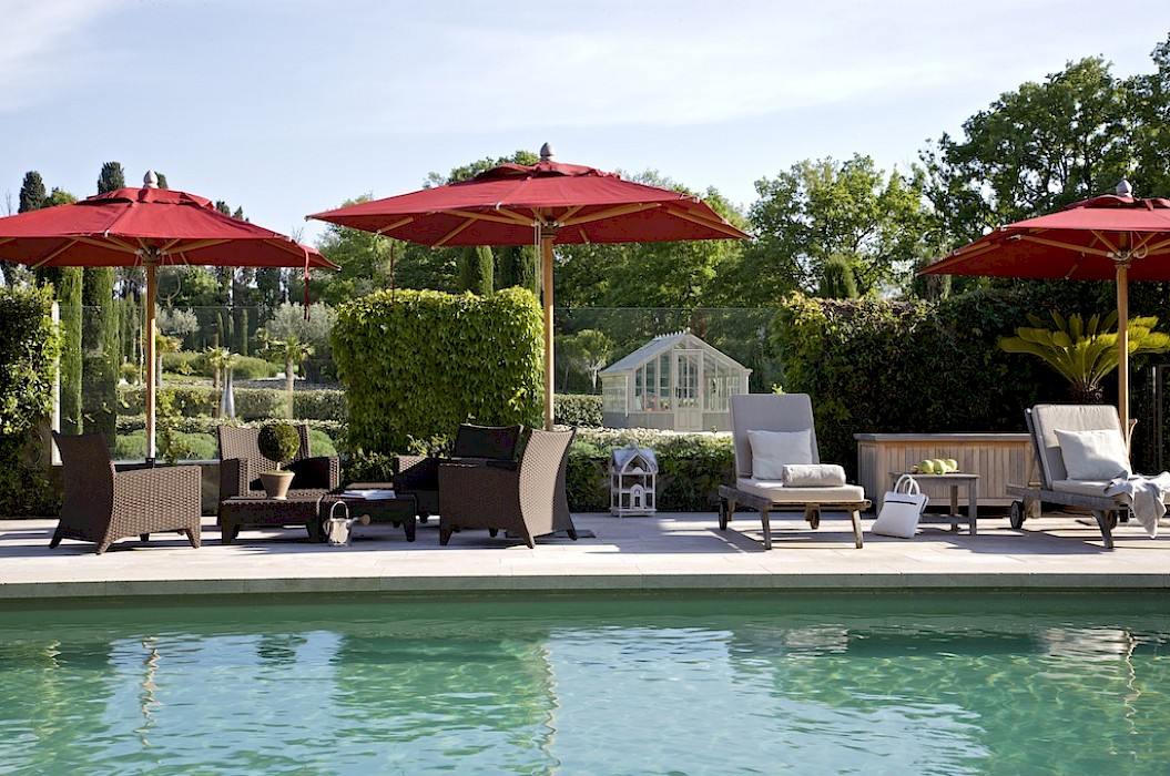 The extensive garden is landscaped with cypress and olive trees…and of course the scent from the lavender plants wafts everywhere on the grounds. A heated pool, Jacuzzi, pool house, professional kitchen and barbeque are surrounded by a beautiful terrace. There’s even a little green house on the property.