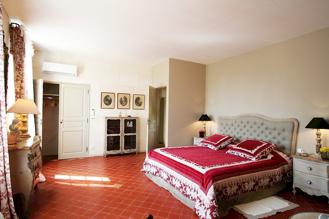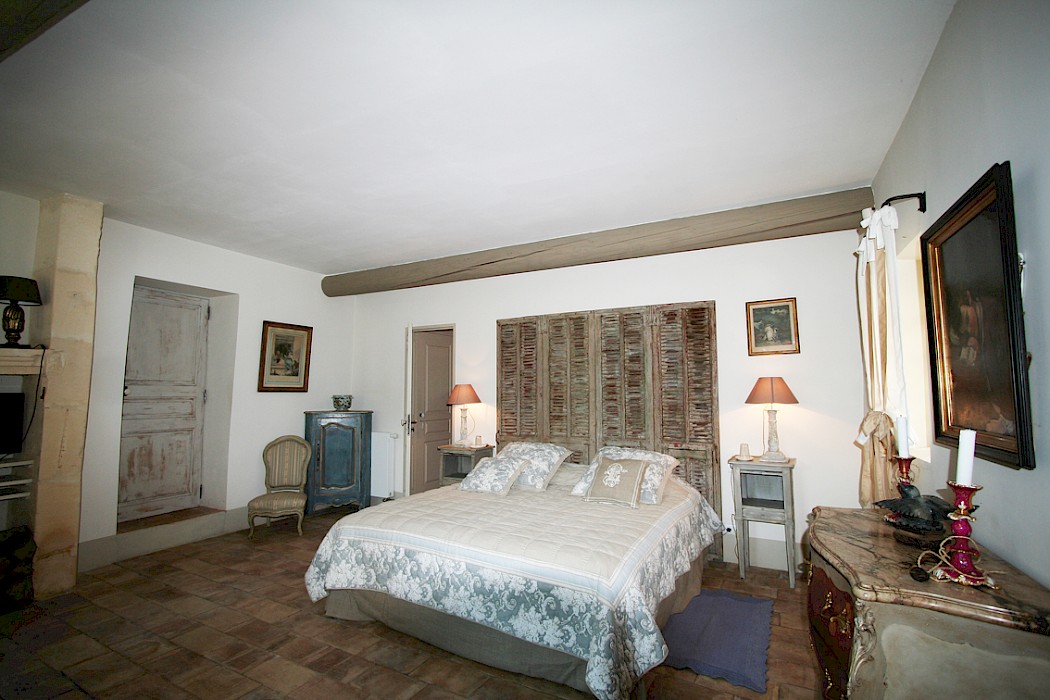 - Large bedroom with a king-size bed (180 cm), fireplace, terrace and an ensuite bathroom with a shower and toilet.