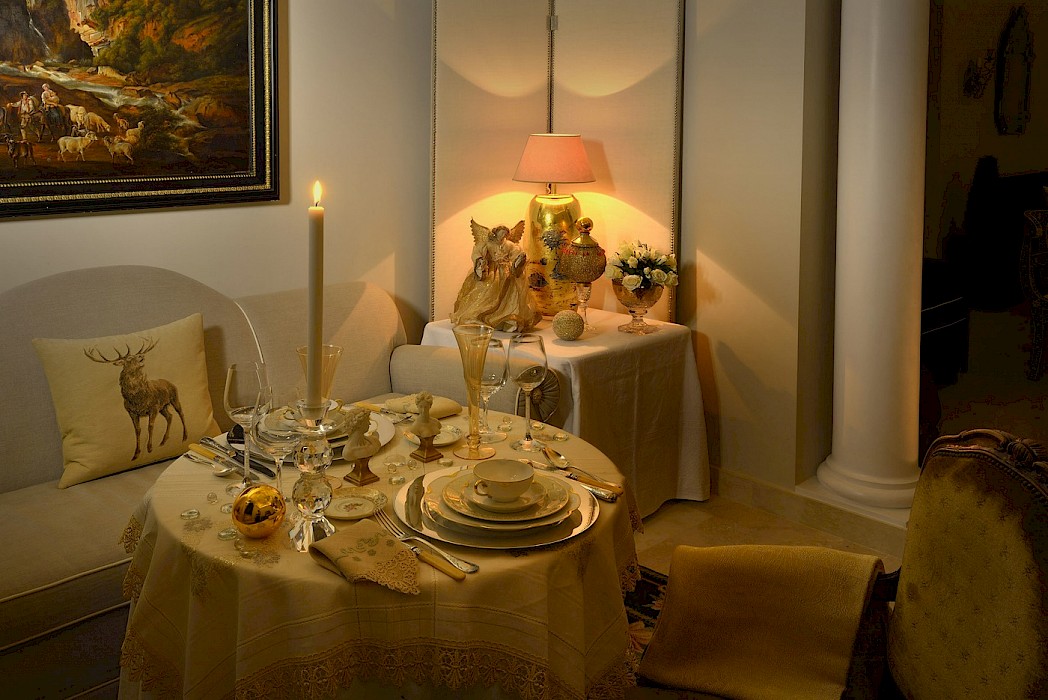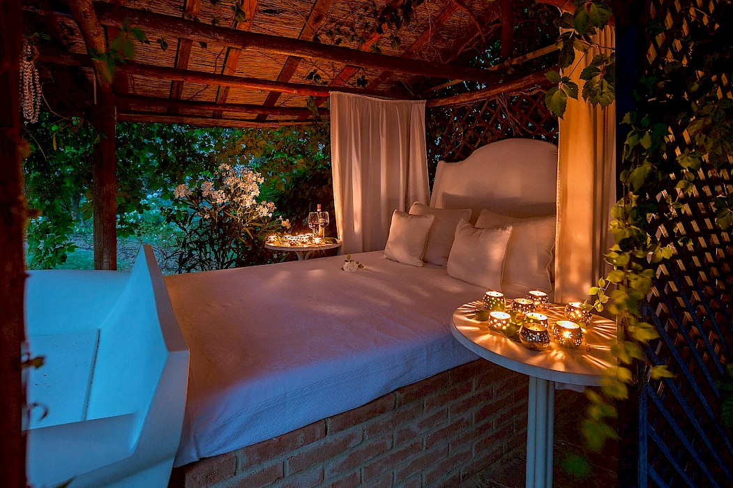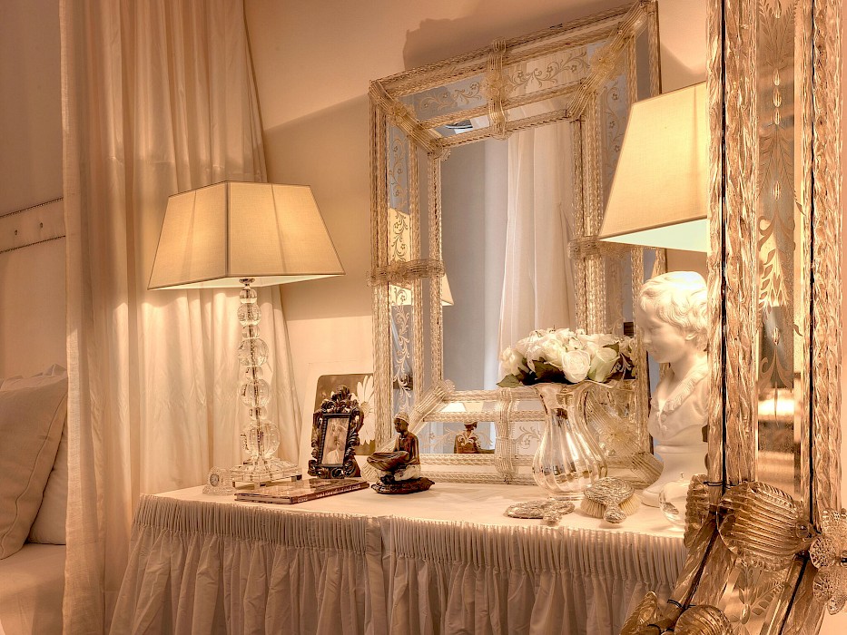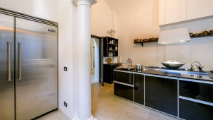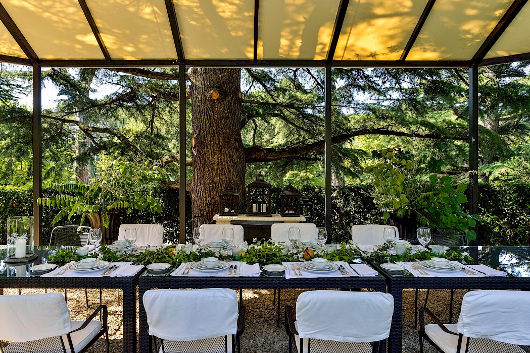 The main characteristic of this villa is the eclectic mixture of classic and contemporary, all refined by impeccable taste and with an interesting choice of prime quality materials. The villa offers a quantity of space and it’s an all-seasons perfect property. The ground floor of the main villa is composed by an impressive entrance hall, a living room with fireplace and library, a modern fully equipped kitchen and an elegant dining room connected to a TV room with DVD and cd player and a small living area with a writing table. On the first floor, connected with a suggestive marble staircase, there are four double bedrooms, three of which are spacious, double bedrooms with en-suite bathrooms with bathtub and shower facilities. The fourth is a luxurious suite with a private terrace overlooking the private park and a double wide shower.