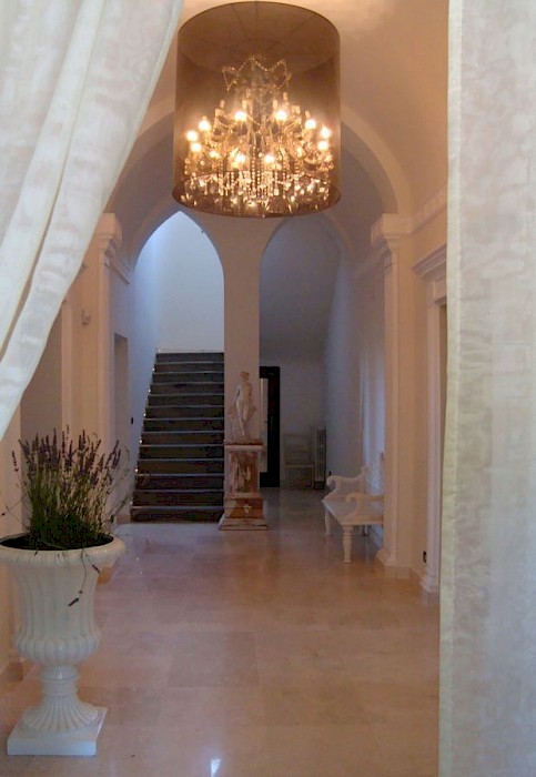 Elegant marble staircase leads to the first floor, Three spacious double bedrooms, each with own private bathroom (bathtub and shower), king size beds, Romantic white honeymoon suite with king-size bed, private terrace, walk-in wardrobe, sensorial shower and freestanding tub.