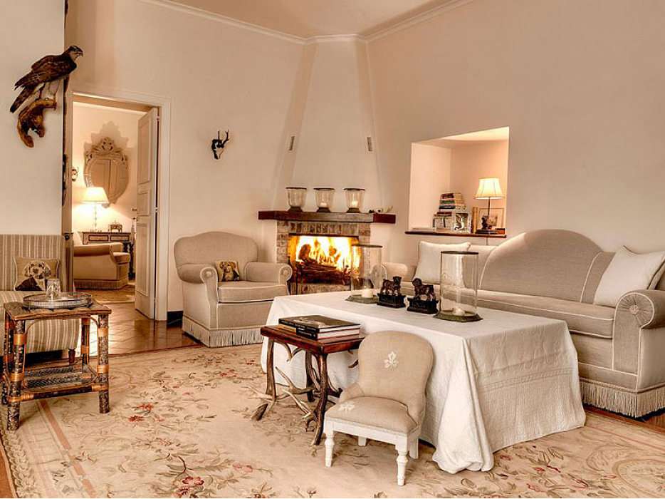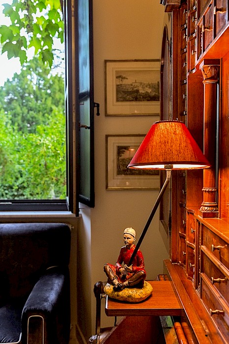 • Sitting room with fireplace and library. From here you can manage the music speakers of the ground floor, the bedrooms of the first floor and the garden (front of the villa only)