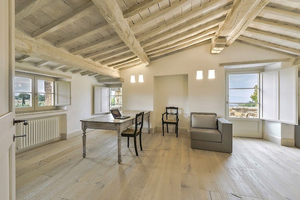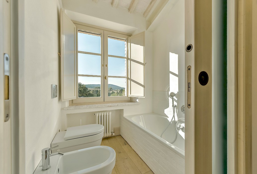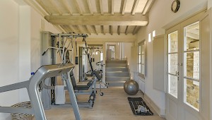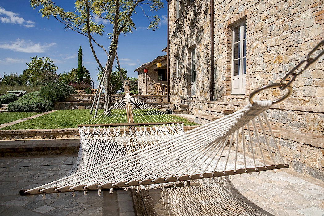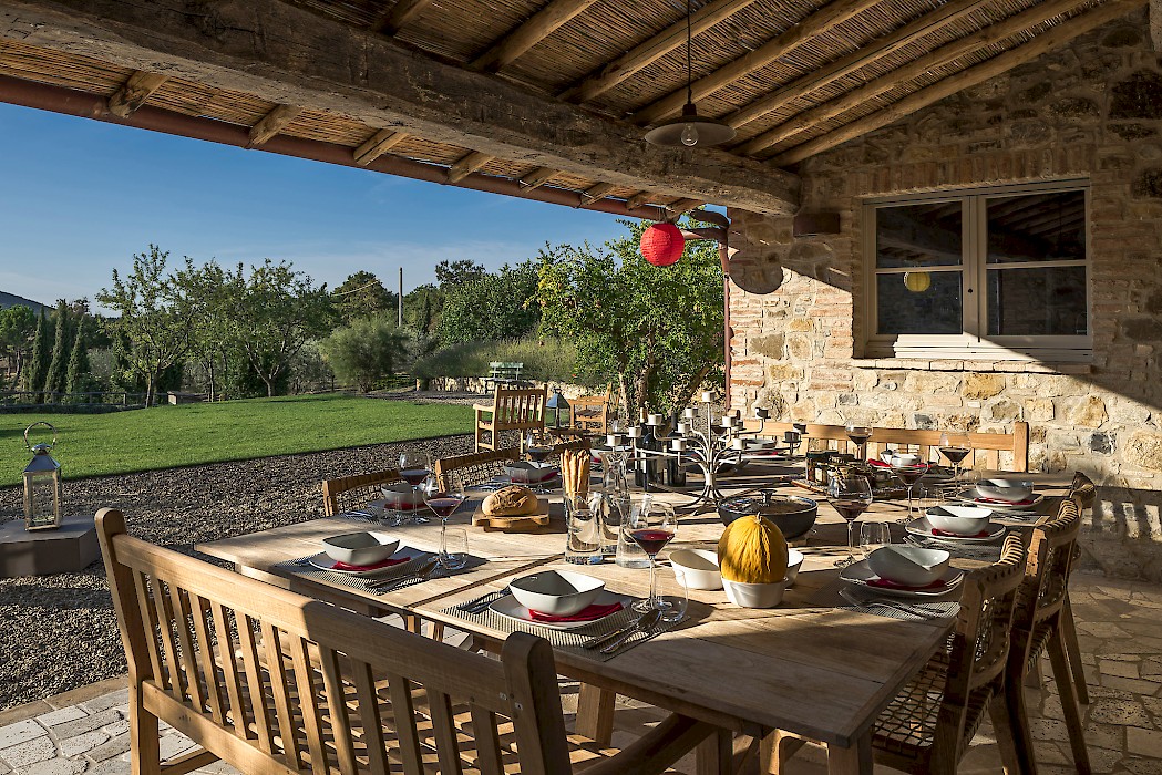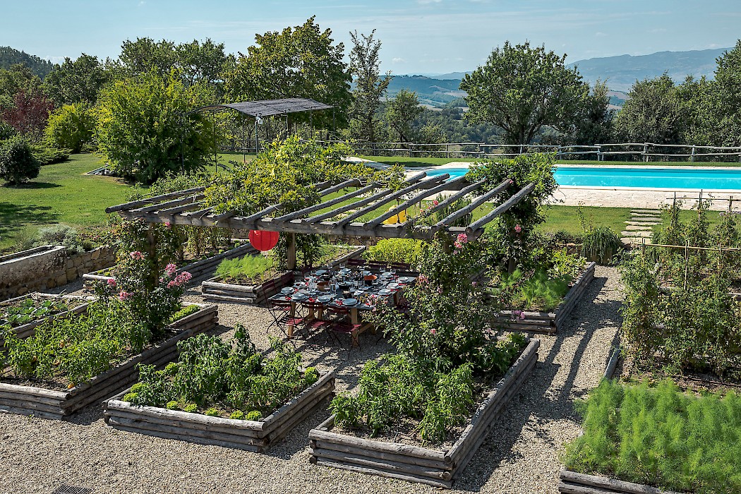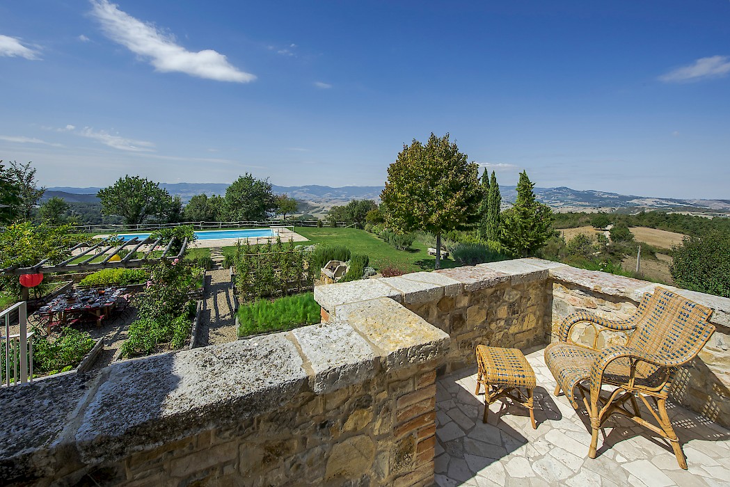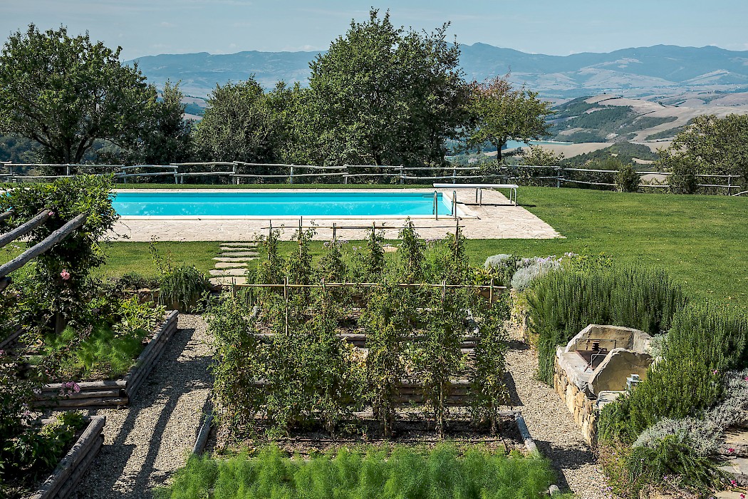 Tranquil and exceptionally manicured grounds include an expansive lawn, a garden with aromatic herbs, such as lavender and rosemary and wild flowers. A private vegetable garden surrounds the pergola near the swimming pool. A spacious portico furnished with large table and chairs is the perfect area for dining al fresco, to fully enjoy the freedom of country living while spared from the heat of the summer Tuscan sun. The sundeck around the private heated swimming pool is furnished and a charming gazebo offers a nice shaded area to enjoy a glass of wine while taking in the breathtaking panoramic views of the Val D’Orcia rolling hills. Outdoor shower