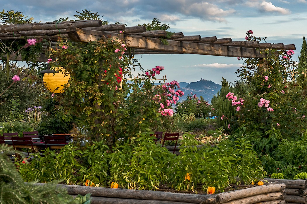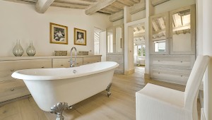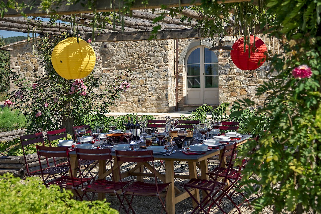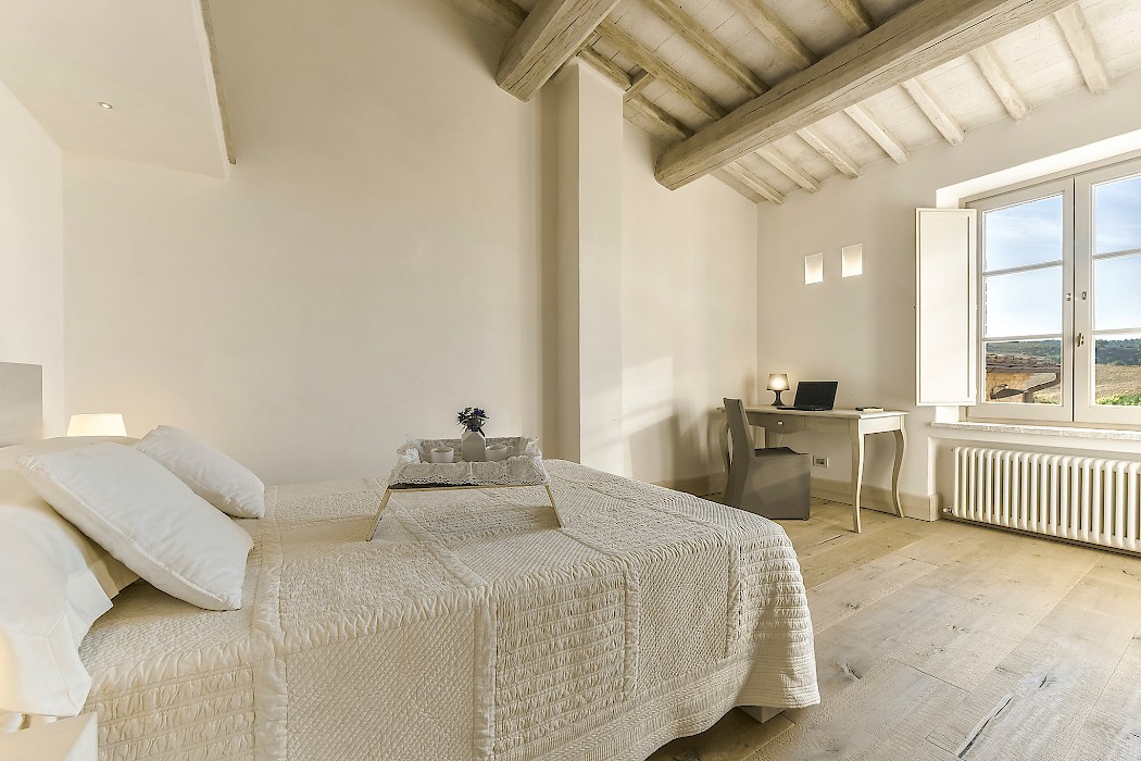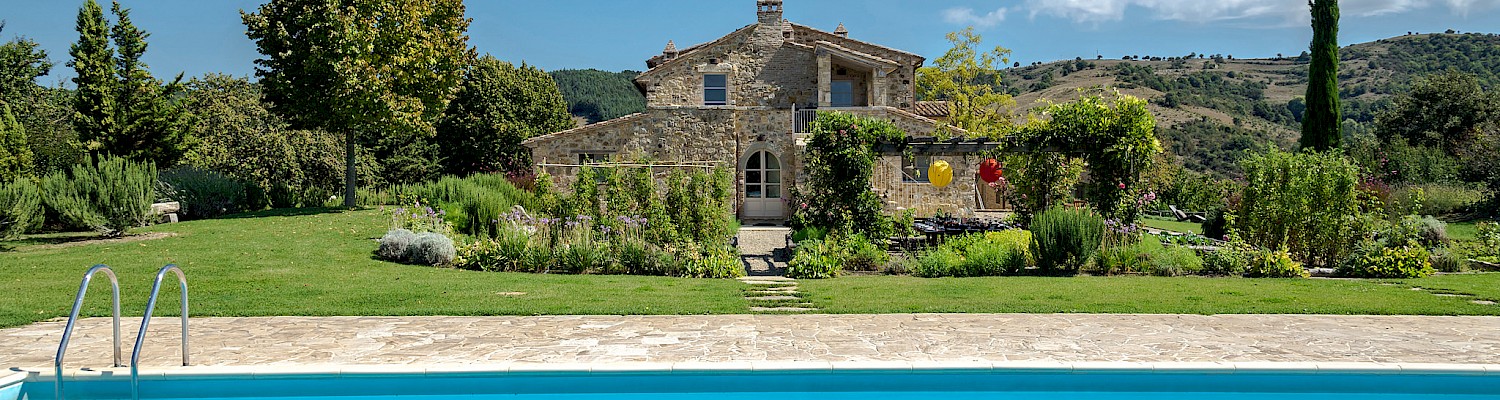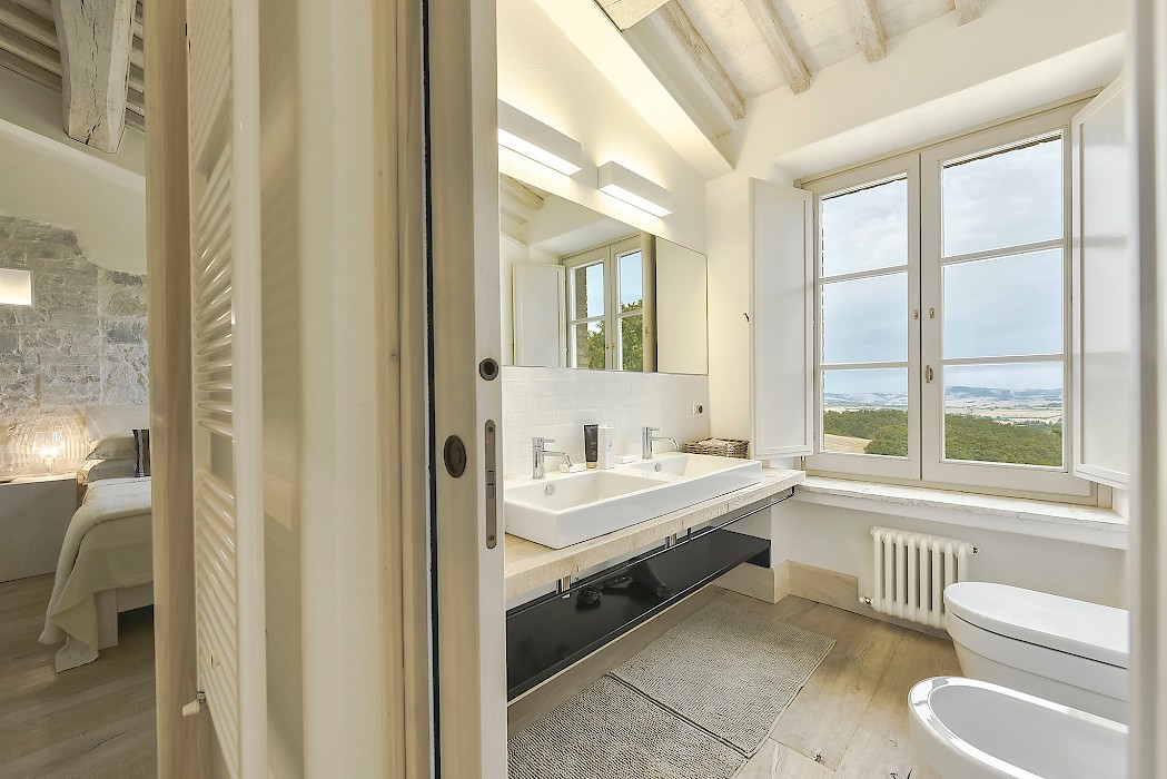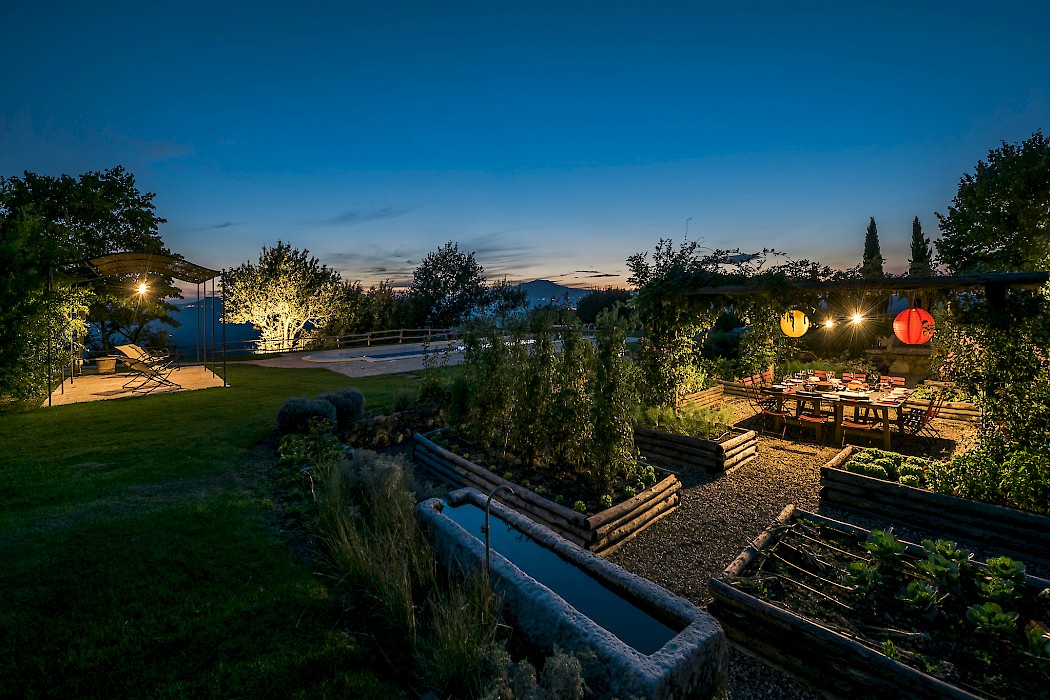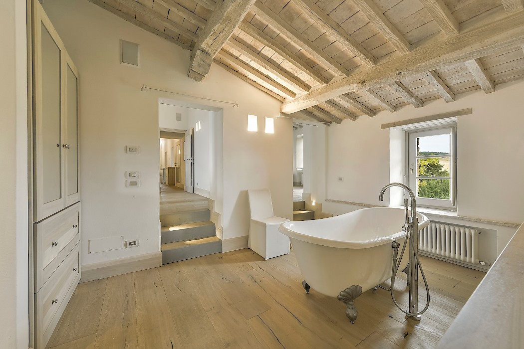 Tranquil and exceptionally manicured grounds include an expansive lawn, a garden with aromatic herbs, such as lavender and rosemary and wild flowers. A private vegetable garden surrounds the pergola near the swimming pool. A spacious portico furnished with large table and chairs is the perfect area for dining al fresco, to fully enjoy the freedom of country living while spared from the heat of the summer Tuscan sun. The sundeck around the private heated swimming pool is furnished and a charming gazebo offers a nice shaded area to enjoy a glass of wine while taking in the breathtaking panoramic views of the Val D’Orcia rolling hills. Outdoor shower