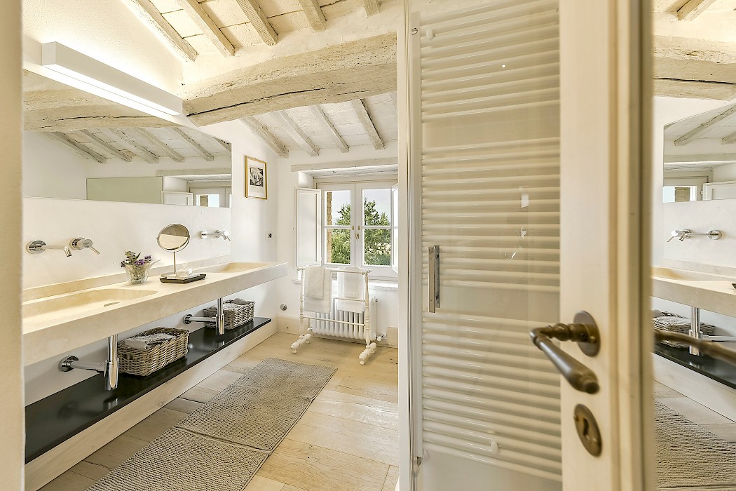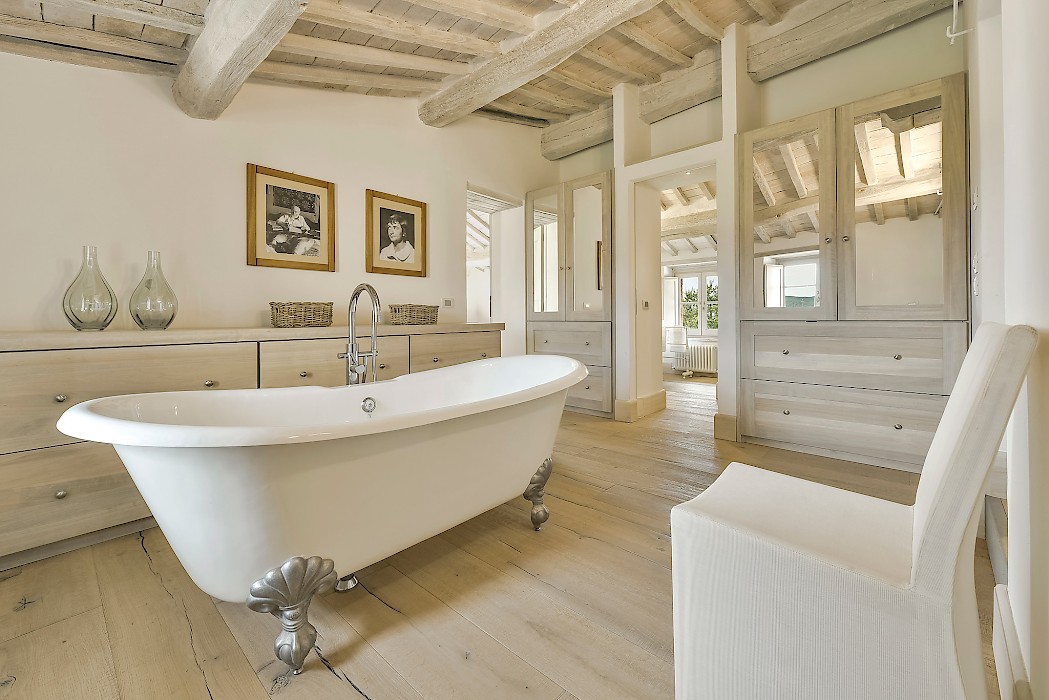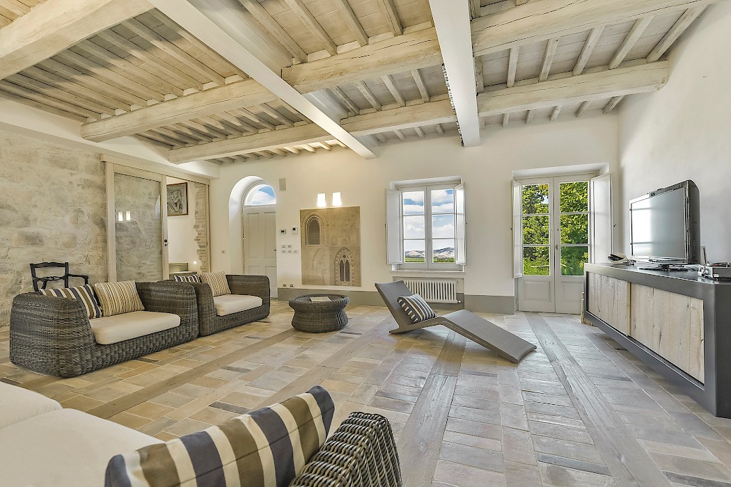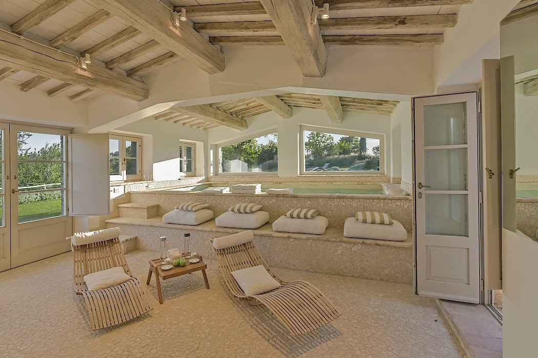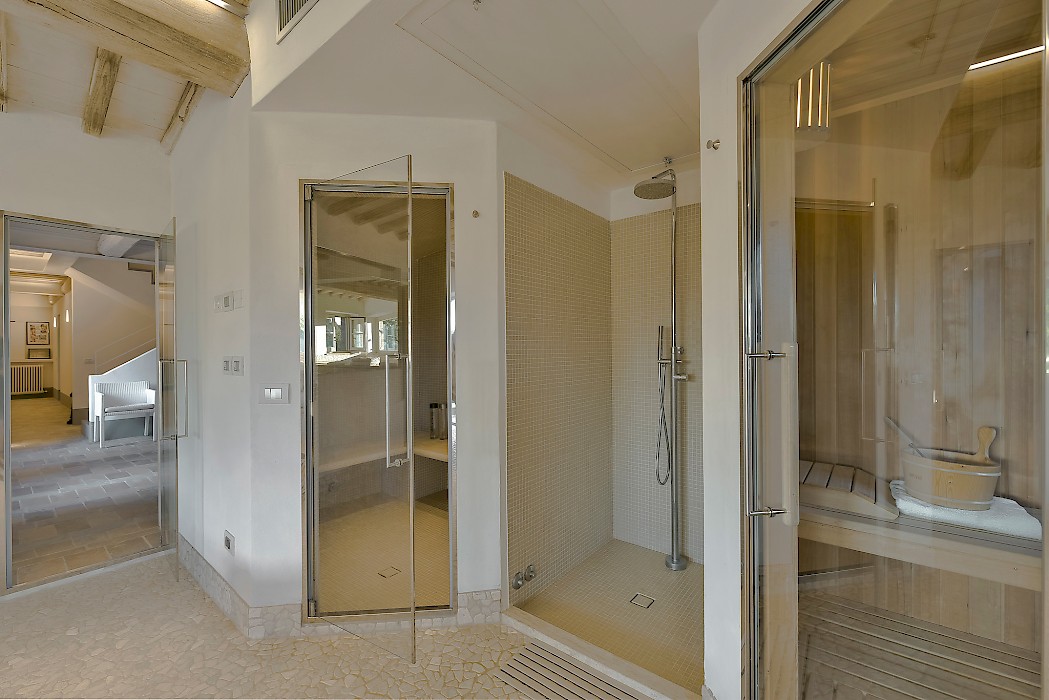 The recent meticulous restoration brought this property back to its authentic character with an eye on modern sophistication through high quality materials, attentive detailing, and a soothing color palette. The custom-built private wellness area includes an indoor swimming pool with counter-current swimming system, a steam room, a sauna, a shower, and a fully equipped gym. These features make the villa an ideal retreat also in the colder months.