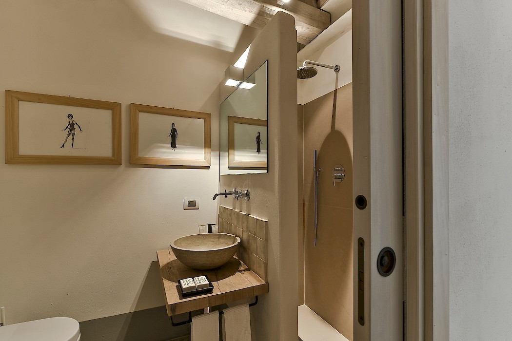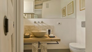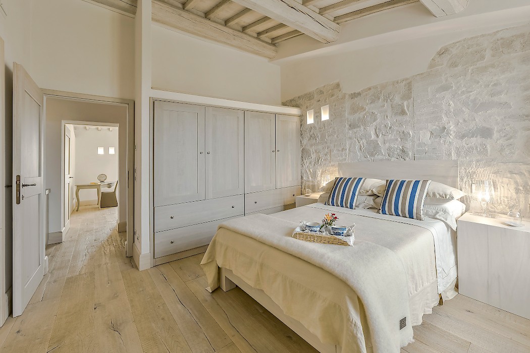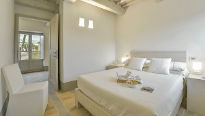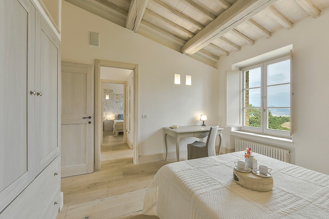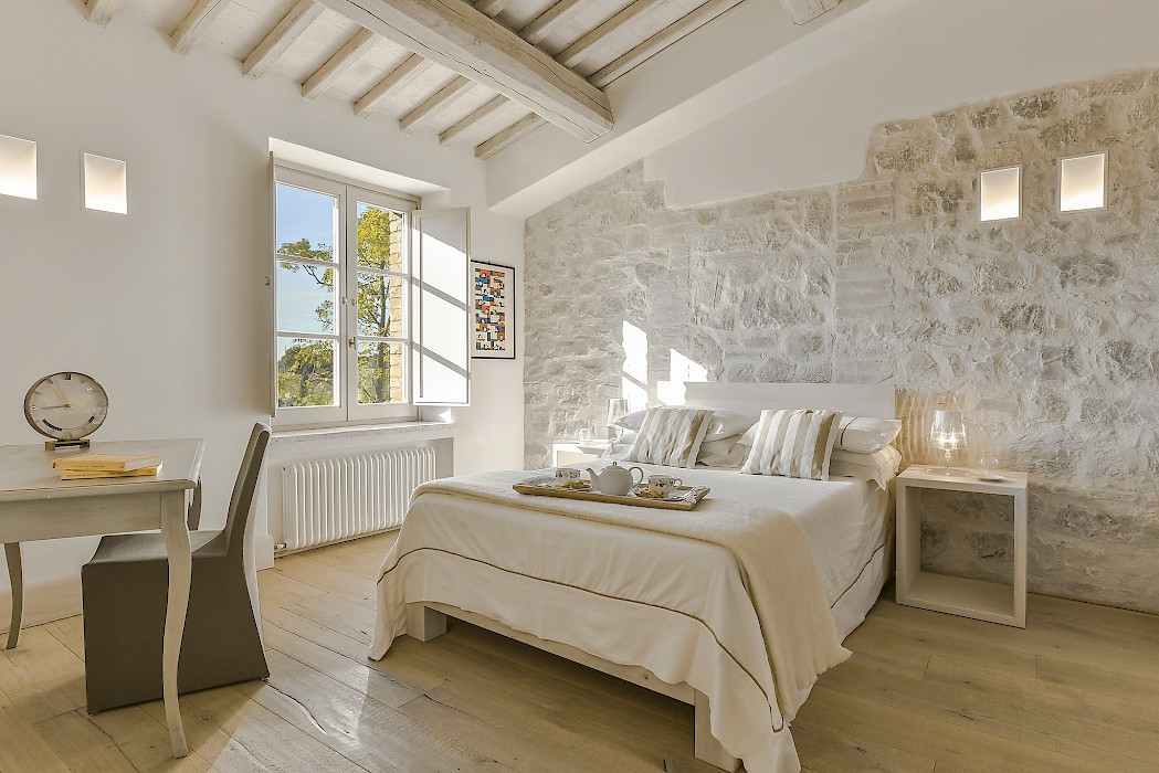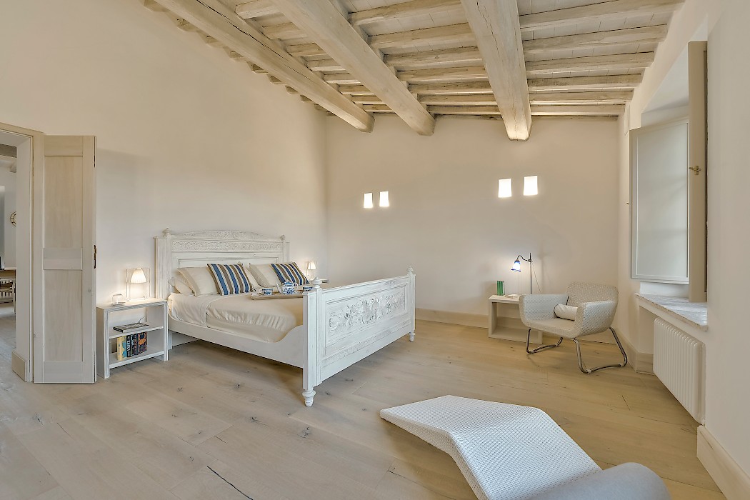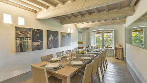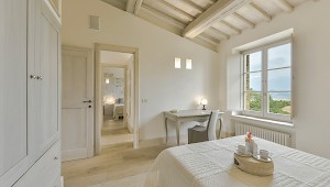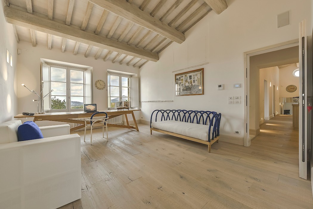 Panoramic sunroom facing the rolling hills offers quiet comfort for some quality time with a good book or just to sit and enjoy beautiful views of the surrounding landscape, while natural light streams in from the French door and the oversize windows. Also on the ground floor, two sophisticated and generous living areas, the formal dining room and the fully equipped kitchen. The neutral tones of the decor, the textured furniture and exquisite repurposed-wood and cotto floors create a warm, calming ambiance. Both living rooms feature a fireplace, where the vibrant color of the art above the mantel of one and the slim sculptures above the other create great focal points for these very well designed rooms. The clean lines of the furniture, the unexpected station clock and the muted color palette contribute to make these rooms, not only interesting, but true aesthetic gems. The eat-in kitchen is impeccable, provided with a large table for breakfast, built-in custom cabinetry with lots of storage, and all the modern appliances a gourmet chef can desire. 2 bedrooms with full size bed (1.50 cm x 200 cm) share a bathroom with shower.