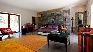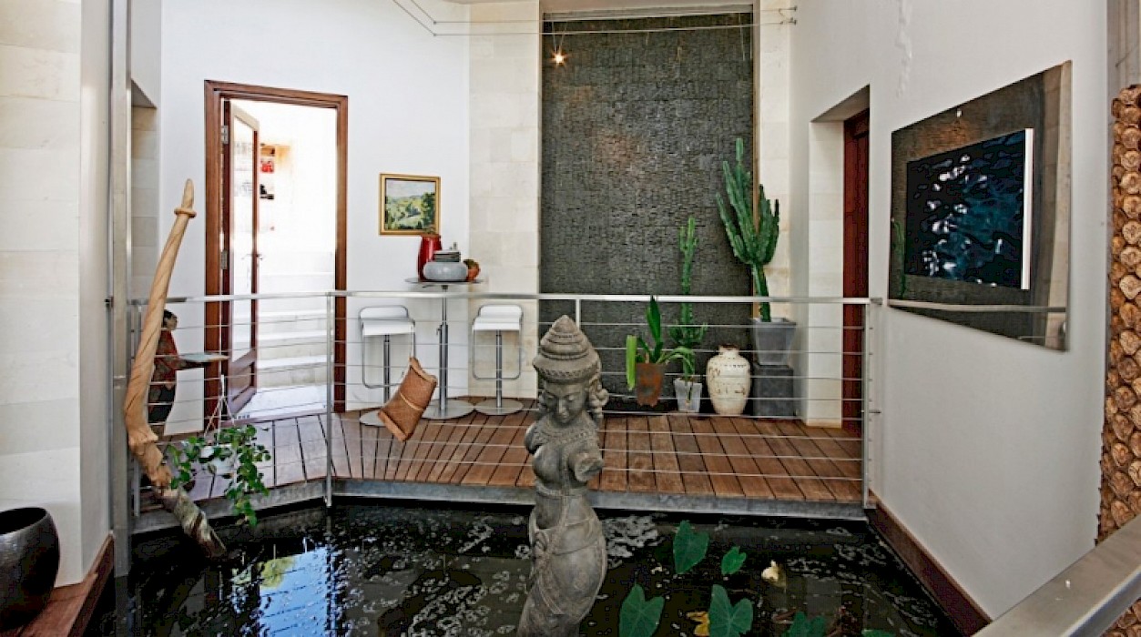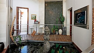 In the middle of the house, there is a cathedral like sitting room with a raised hallway on the first floor and volcanic stone walls. On the south side of the house, is a retractable picture window that opens open onto a large terrace overlooking the ornamental pool. This central living area has been arranged with a large fireplace, piano and sofas.