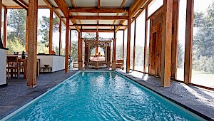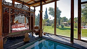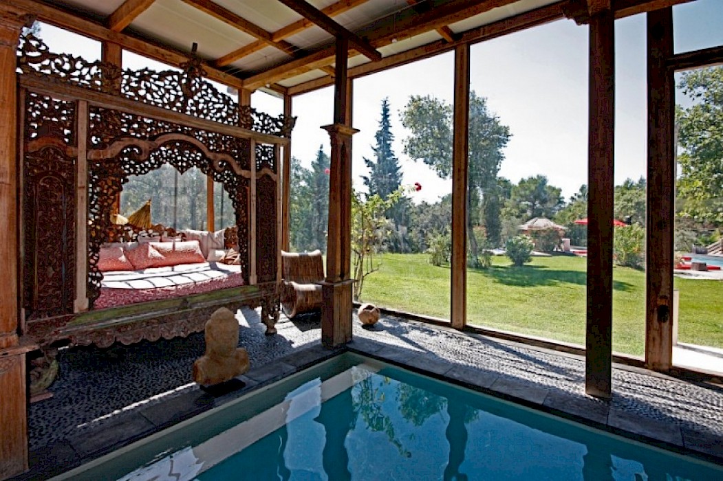The heated indoor swimming pool (8 m x 3 m) is equipped with jets and niches in an area dedicated to quietness and relaxation with a fireplace, and a large Indonesian bed. Following the main house structure this space is entirely glassed-in and is sheltered by the framework of a Balinese house and its colonnades.