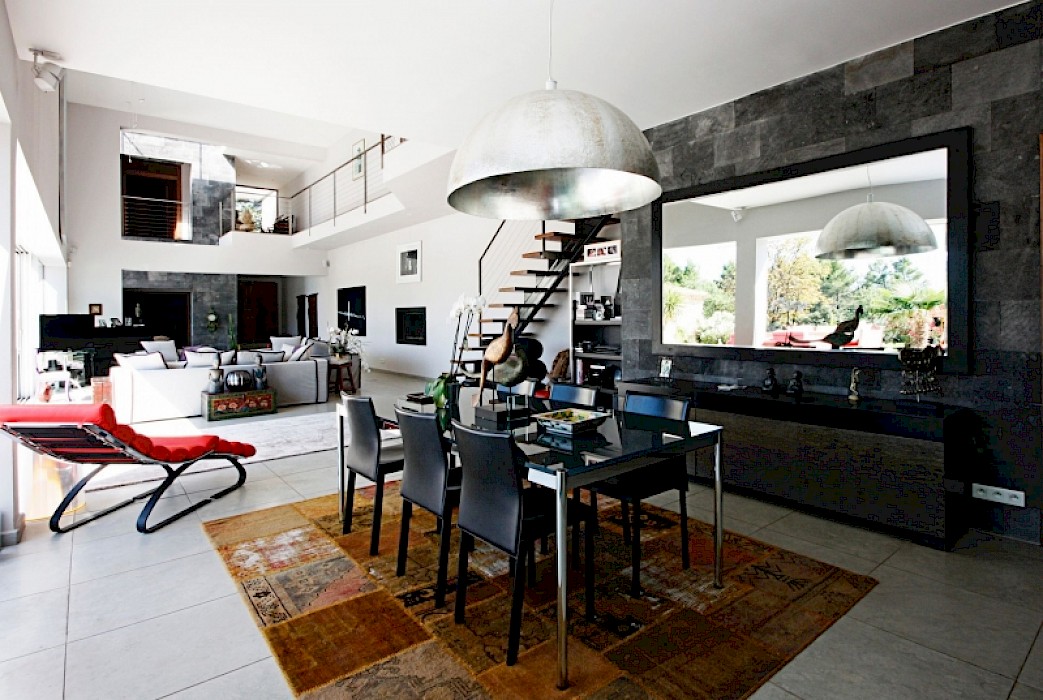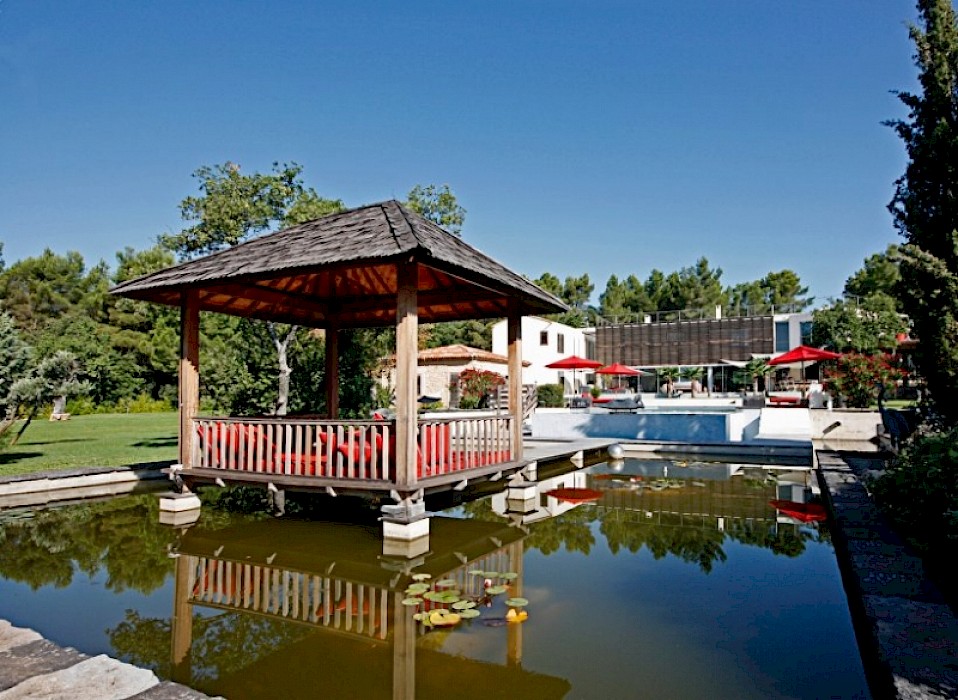 Surrounded by trees the gardens (1 hectare) are beautifully landscaped with many water points and match perfectly with the Zen spirit of this surprising property. Facing the house, there is a huge outdoor swimming pool (16 m x 6 m) which flows into a decorative pool with wooden walkways between water lilies and fishes. Near the swimming pool there is also a heated Jacuzzi.