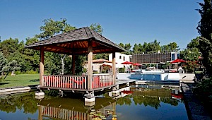 - Huge outdoor swimming pool (52 x 19 ft) which flows into a pool with a path of duckboards between water lilies and fish