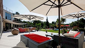 Another decorative waterway runs along the West side of the house and is lit at night. An outdoor staircase leads to the house's roof and its huge hardwood terrace with a magnificent view, a spa and garden furniture to relax.