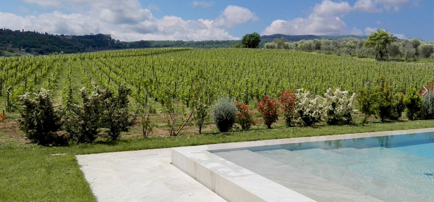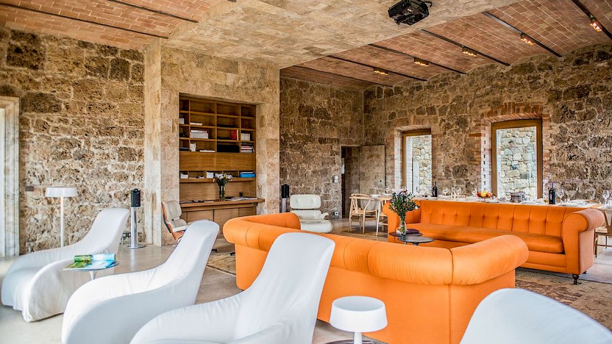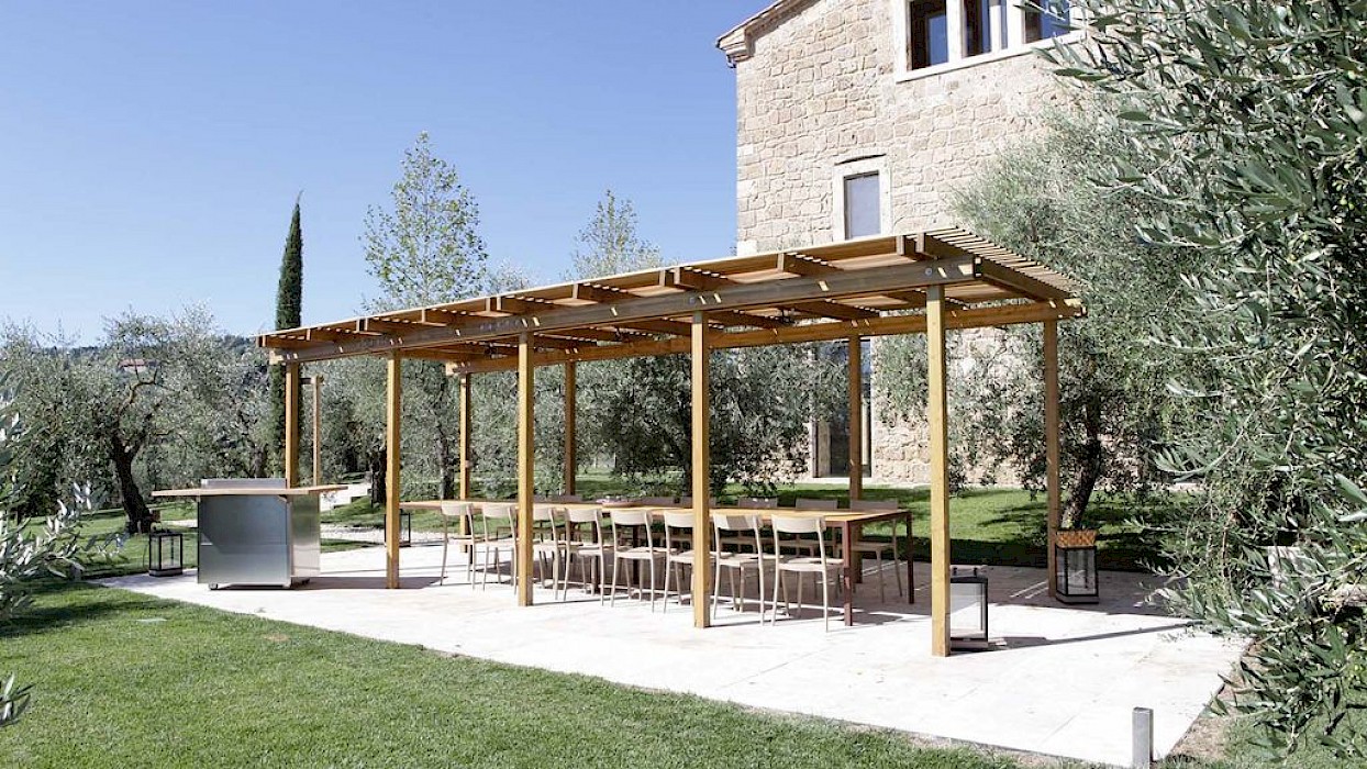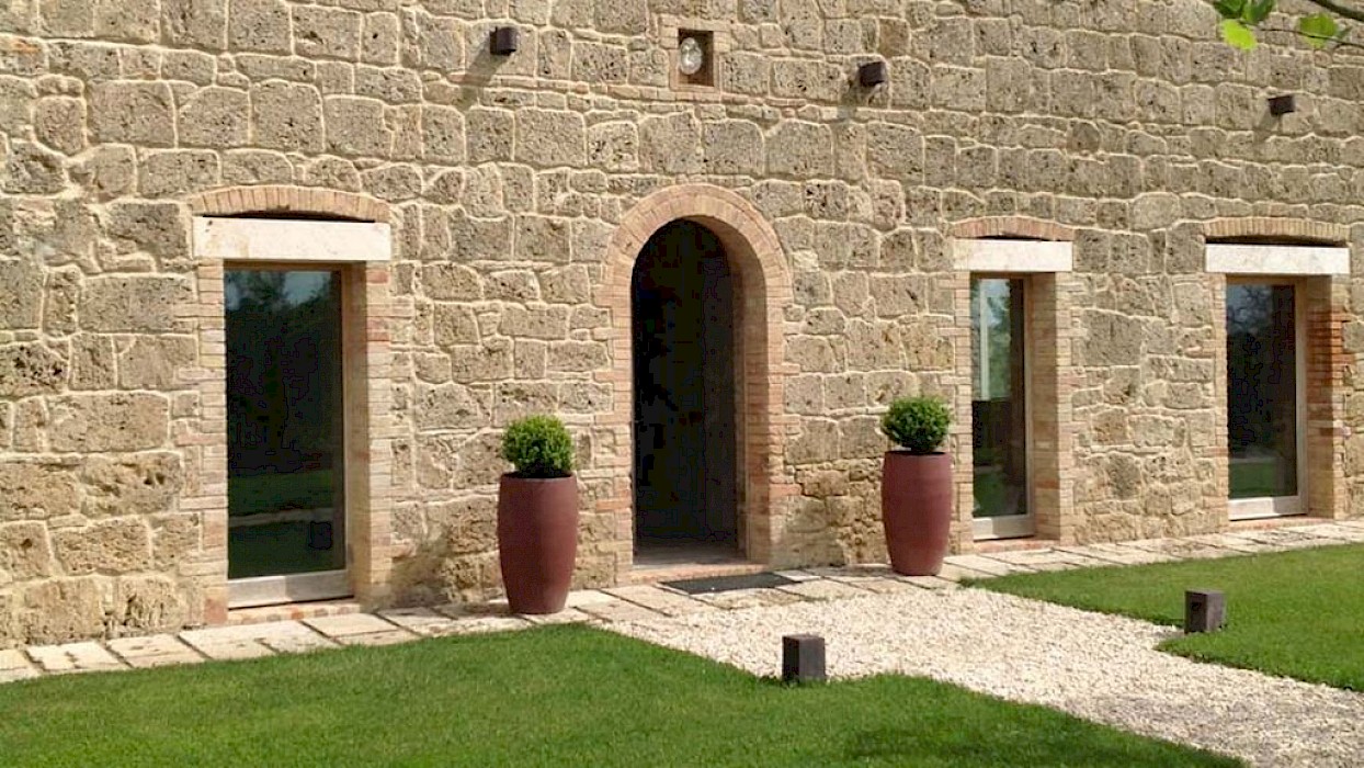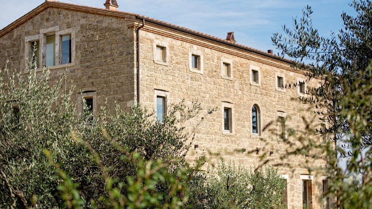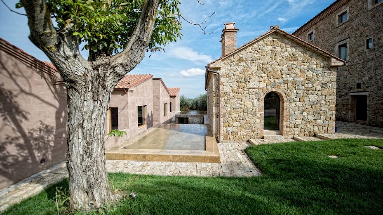A glimpse of paradise at the end of the dirt road that leads to the villa, set on a knoll and suspended in the heart of the Tuscan countryside south of Siena, just outside the charming borgo of Sarteano, in an inimitable scenario of geometric patterns of extensive rows of vines and of a sea of olive trees that guard the property. In its centre appears the imposing structure of the 18th century farmhouse, now converted into a technologically-advanced luxury villa by architectural intervention of the highest quality. The house features exposed stone combined with wood and terracotta, in an impressive recycling of the past which has forged the present design, in which respect for local tradition combines with a fine choice of minimal and essential modernity, designed to offer guests all amenities for a perfect stay. The spacious rooms are a blaze of light, enhanced by the large windows in the living area and in the splendid bedrooms, super-equipped with private bathrooms; the furnishings, declined in the natural colours of wood, have plain and simple lines, geared to maximum functionality and efficiency. In an adjoining annex is a fitness area with a gym and a stupendous wellness room, equipped with sauna, Turkish bath and massage and treatment area (available on request). Outside, the beautiful panoramic pool, the bowling green, the cosy set-up areas and and the large green spaces will complement unforgettable days spent in the open air. This is the ideal choice for an exclusive stay in a charming, elegant residence that guarantees privacy and maximum tranquillity thanks to its secluded location and yet, at the same time, is very close to road and motorway links and is the perfect focal point, located between the southern Val di Chiana and the rough and wild Val d'Orcia, for exploring an amazing geographical region. Sarteano, with its architectural and naturalistic heritage and its impressive monuments within the old medieval town walls, is just ten minutes away but also not far away are the magnificent towns of Chiusi, Montepulciano, Pienza, Montalcino, Chianciano Terme, San Casciano dei Bagni and many other places of historical and artistic interest with their timeless charm. This prestigious property is part of an agritourism estate committed to organic farming with the best produce that Tuscany has to offer and which continues, in the modern age, to maintain the taste of authentic tradition: excellent extra-virgin olive oil and wine from autochthonous and allochthonous vines in the aromas of Sangiovese, Merlot and Cabernet which the owners will be delighted to offer for tasting in the fabulous multi-function room next to the house, along with other choice products like vinsanto (sweet white dessert wine), organic preserves and jams. Upon request, you can organize cooking lessons in the large professional kitchen or avail yourself of domestic staff and a chef for the entire stay.