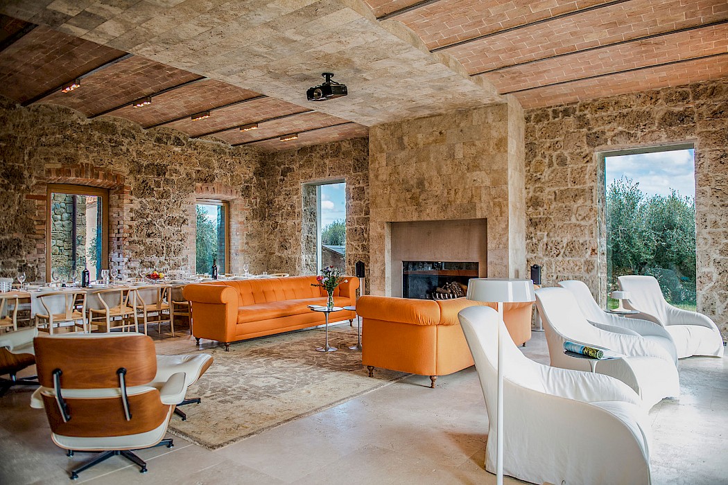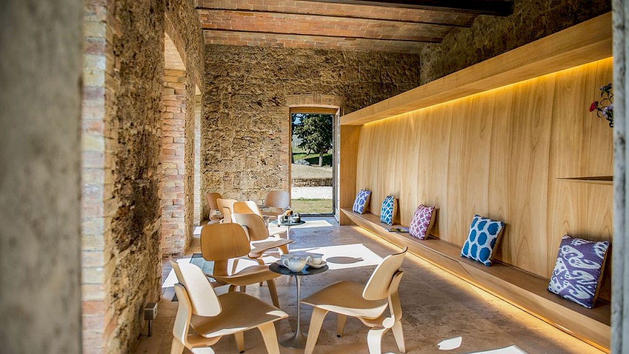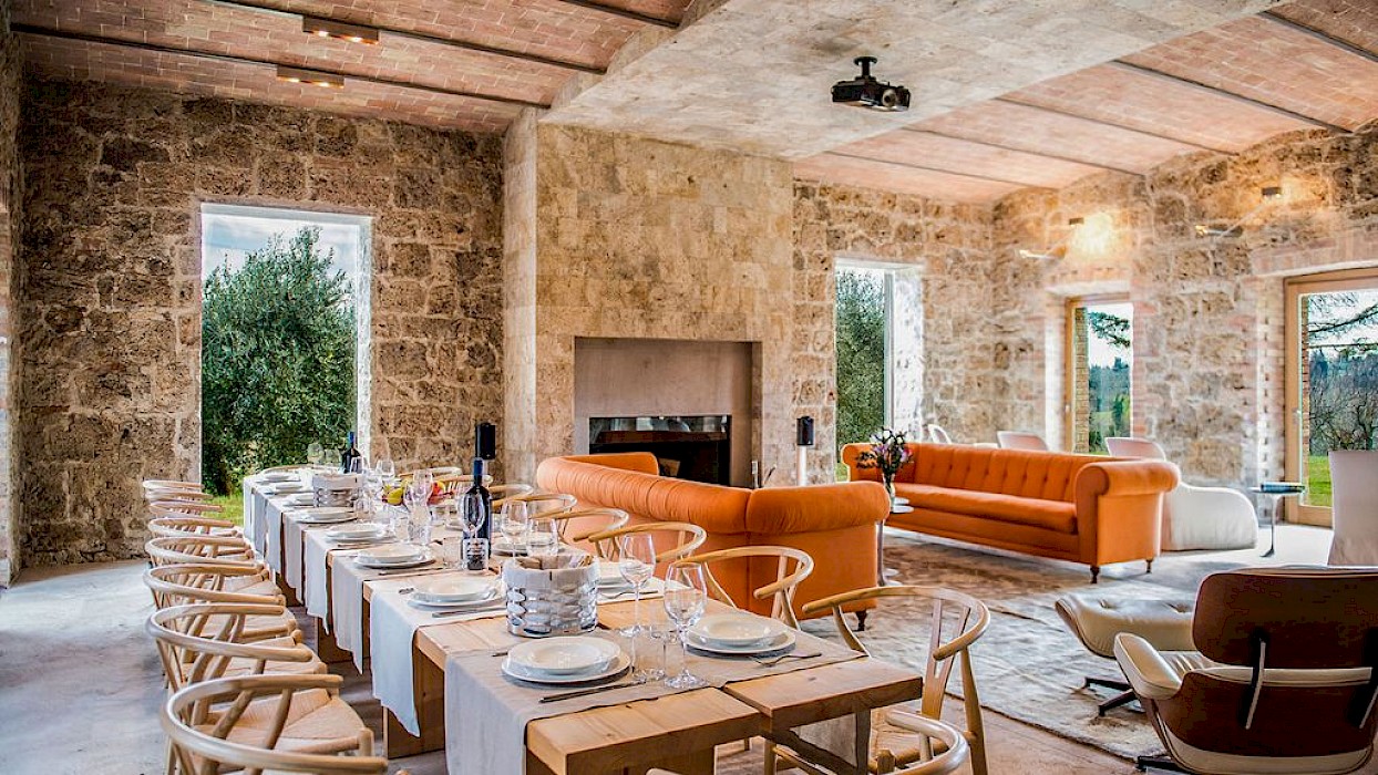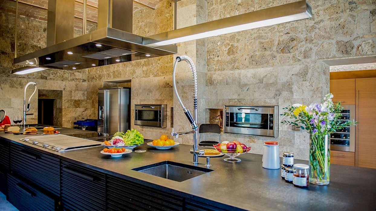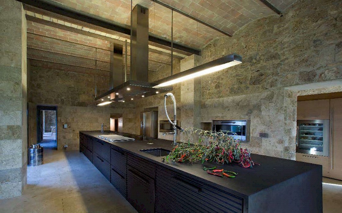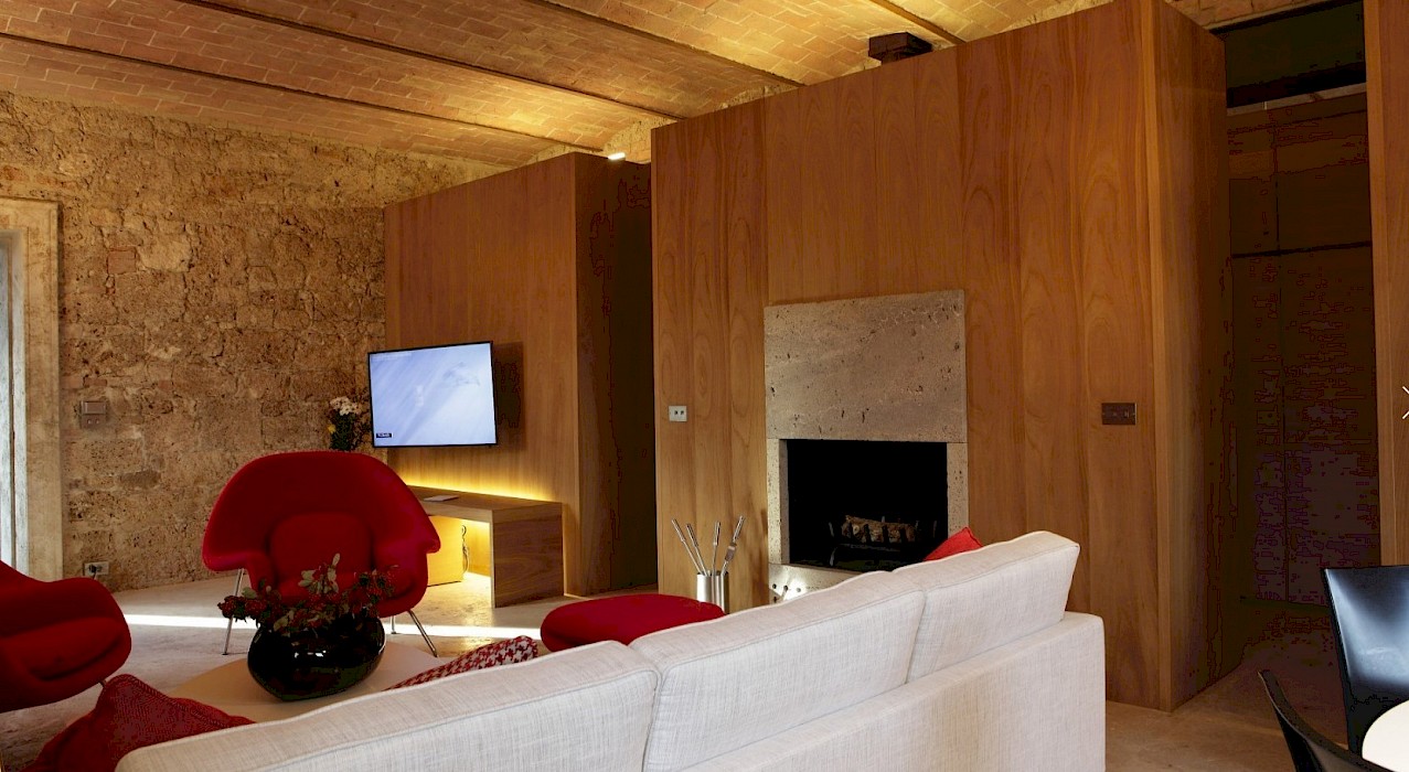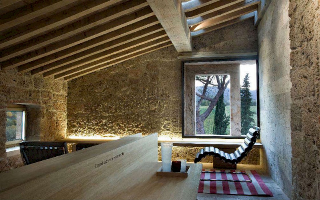 A glimpse of paradise at the end of the dirt road that leads to the villa, set on a knoll and suspended in the heart of the Tuscan countryside south of Siena, just outside the charming borgo of Sarteano, in an inimitable scenario of geometric patterns of extensive rows of vines and of a sea of olive trees that guard the property. In its centre appears the imposing structure of the 18th century farmhouse, now converted into a technologically-advanced luxury villa by architectural intervention of the highest quality. The house features exposed stone combined with wood and terracotta, in an impressive recycling of the past which has forged the present design, in which respect for local tradition combines with a fine choice of minimal and essential modernity, designed to offer guests all amenities for a perfect stay. The spacious rooms are a blaze of light, enhanced by the large windows in the living area and in the splendid bedrooms, super-equipped with private bathrooms; the furnishings, declined in the natural colours of wood, have plain and simple lines, geared to maximum functionality and efficiency. In an adjoining annex is a fitness area with a gym and a stupendous wellness room, equipped with sauna, Turkish bath and massage and treatment area (available on request). Outside, the beautiful panoramic pool, the bowling green, the cosy set-up areas and and the large green spaces will complement unforgettable days spent in the open air. This is the ideal choice for an exclusive stay in a charming, elegant residence that guarantees privacy and maximum tranquillity thanks to its secluded location and yet, at the same time, is very close to road and motorway links and is the perfect focal point, located between the southern Val di Chiana and the rough and wild Val d'Orcia, for exploring an amazing geographical region. Sarteano, with its architectural and naturalistic heritage and its impressive monuments within the old medieval town walls, is just ten minutes away but also not far away are the magnificent towns of Chiusi, Montepulciano, Pienza, Montalcino, Chianciano Terme, San Casciano dei Bagni and many other places of historical and artistic interest with their timeless charm. This prestigious property is part of an agritourism estate committed to organic farming with the best produce that Tuscany has to offer and which continues, in the modern age, to maintain the taste of authentic tradition: excellent extra-virgin olive oil and wine from autochthonous and allochthonous vines in the aromas of Sangiovese, Merlot and Cabernet which the owners will be delighted to offer for tasting in the fabulous multi-function room next to the house, along with other choice products like vinsanto (sweet white dessert wine), organic preserves and jams. Upon request, you can organize cooking lessons in the large professional kitchen or avail yourself of domestic staff and a chef for the entire stay.