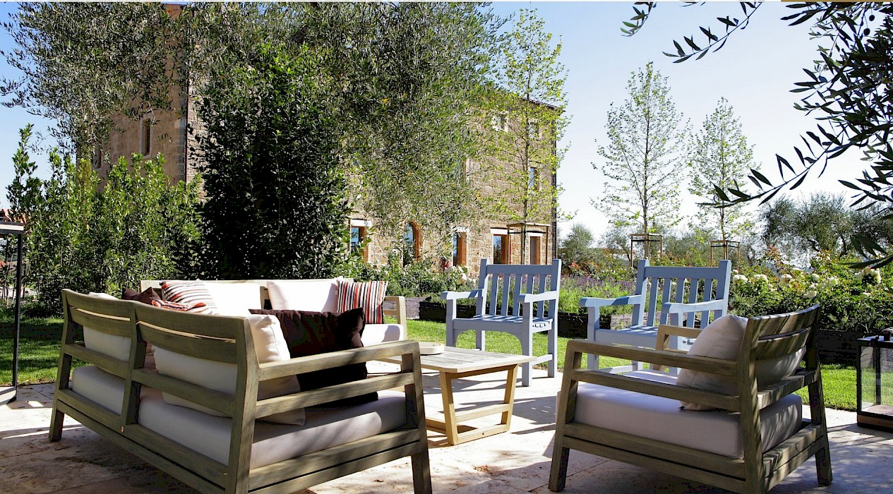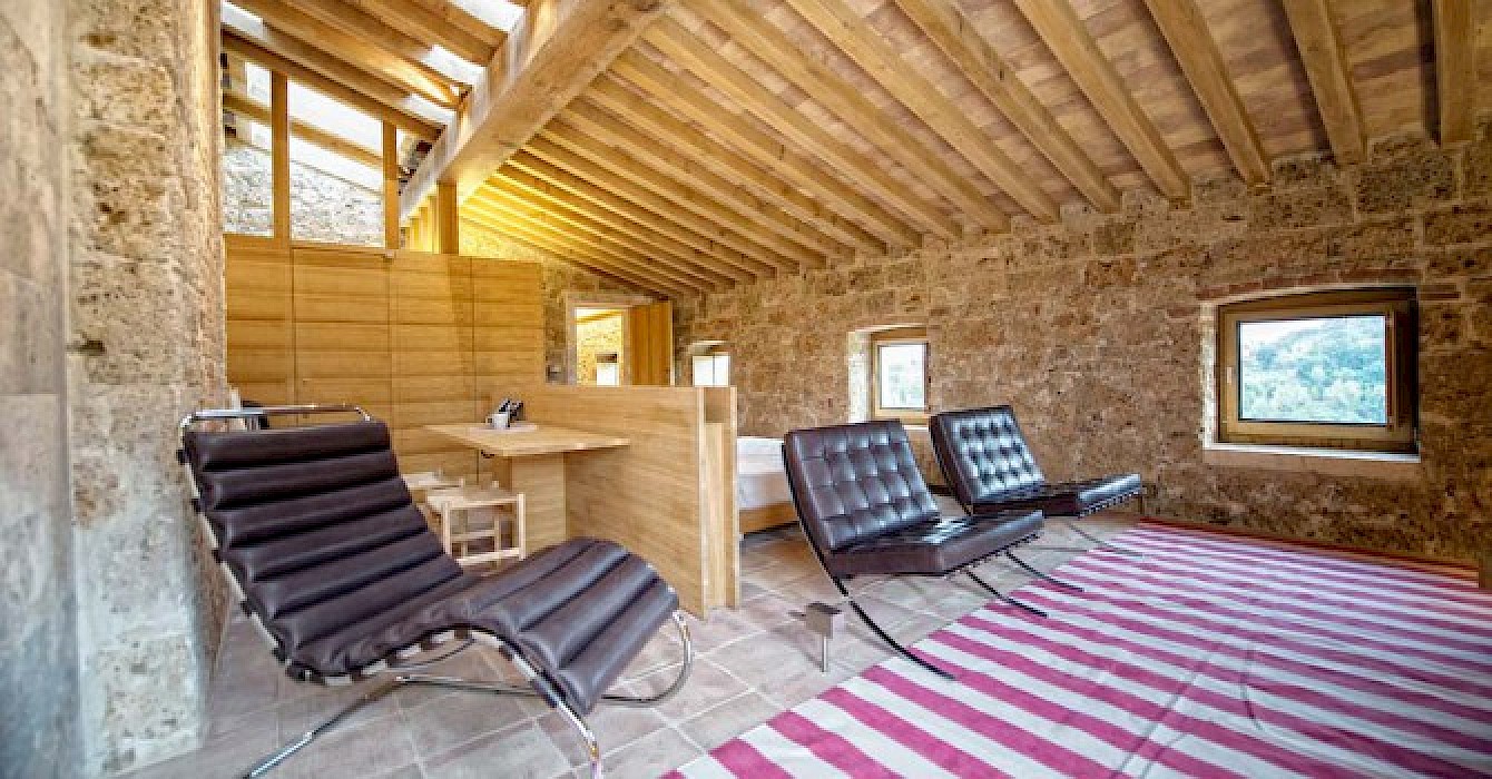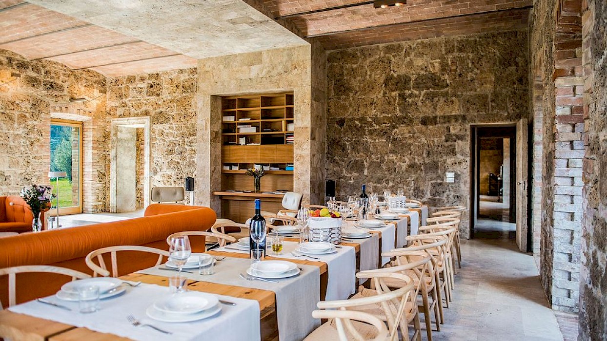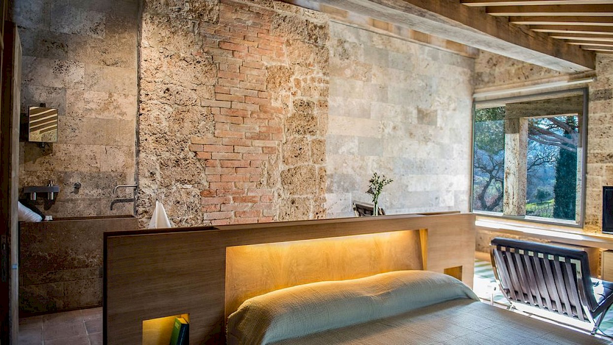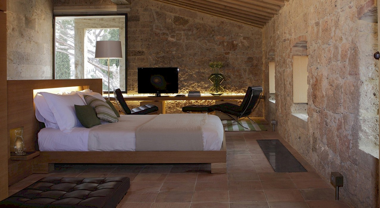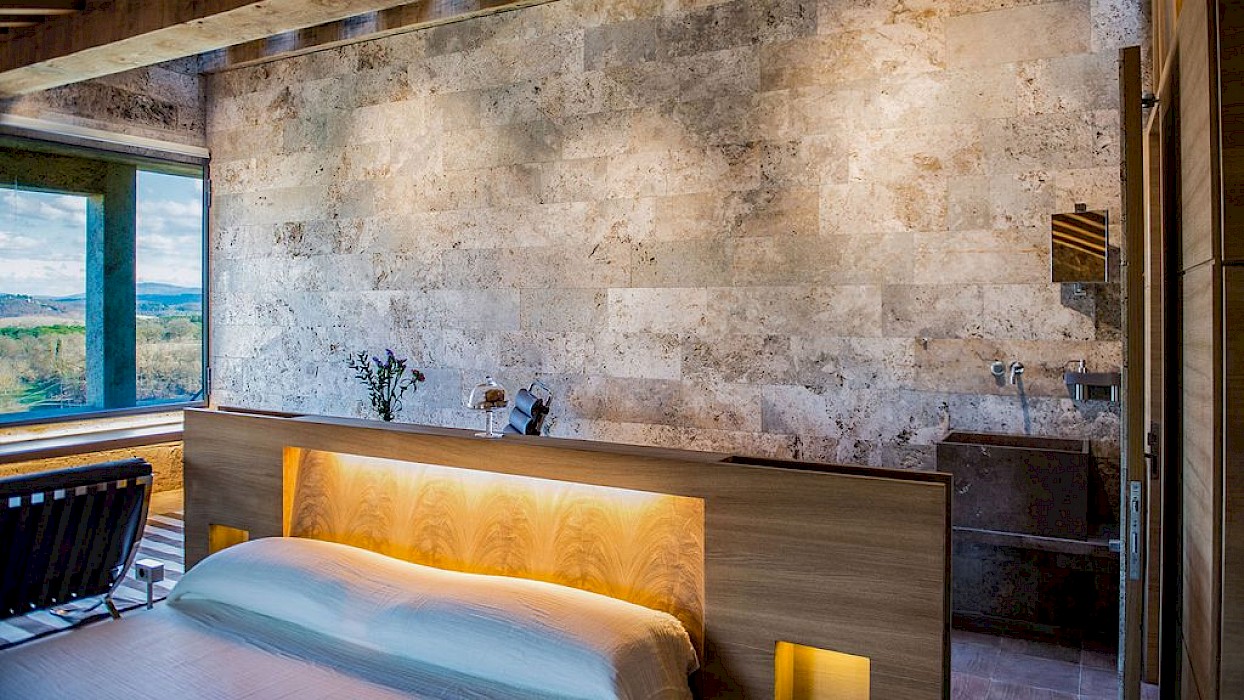 A glimpse of paradise at the end of the dirt road that leads to the villa, set on a knoll and suspended in the heart of the Tuscan countryside south of Siena, just outside the charming borgo of Sarteano, in an inimitable scenario of geometric patterns of extensive rows of vines and of a sea of olive trees that guard the property. In its centre appears the imposing structure of the 18th century farmhouse, now converted into a technologically-advanced luxury villa by architectural intervention of the highest quality. The house features exposed stone combined with wood and terracotta, in an impressive recycling of the past which has forged the present design, in which respect for local tradition combines with a fine choice of minimal and essential modernity, designed to offer guests all amenities for a perfect stay. The spacious rooms are a blaze of light, enhanced by the large windows in the living area and in the splendid bedrooms, super-equipped with private bathrooms; the furnishings, declined in the natural colours of wood, have plain and simple lines, geared to maximum functionality and efficiency. In an adjoining annex is a fitness area with a gym and a stupendous wellness room, equipped with sauna, Turkish bath and massage and treatment area (available on request). Outside, the beautiful panoramic pool, the bowling green, the cosy set-up areas and and the large green spaces will complement unforgettable days spent in the open air. This is the ideal choice for an exclusive stay in a charming, elegant residence that guarantees privacy and maximum tranquillity thanks to its secluded location and yet, at the same time, is very close to road and motorway links and is the perfect focal point, located between the southern Val di Chiana and the rough and wild Val d'Orcia, for exploring an amazing geographical region. Sarteano, with its architectural and naturalistic heritage and its impressive monuments within the old medieval town walls, is just ten minutes away but also not far away are the magnificent towns of Chiusi, Montepulciano, Pienza, Montalcino, Chianciano Terme, San Casciano dei Bagni and many other places of historical and artistic interest with their timeless charm. This prestigious property is part of an agritourism estate committed to organic farming with the best produce that Tuscany has to offer and which continues, in the modern age, to maintain the taste of authentic tradition: excellent extra-virgin olive oil and wine from autochthonous and allochthonous vines in the aromas of Sangiovese, Merlot and Cabernet which the owners will be delighted to offer for tasting in the fabulous multi-function room next to the house, along with other choice products like vinsanto (sweet white dessert wine), organic preserves and jams. Upon request, you can organize cooking lessons in the large professional kitchen or avail yourself of domestic staff and a chef for the entire stay.