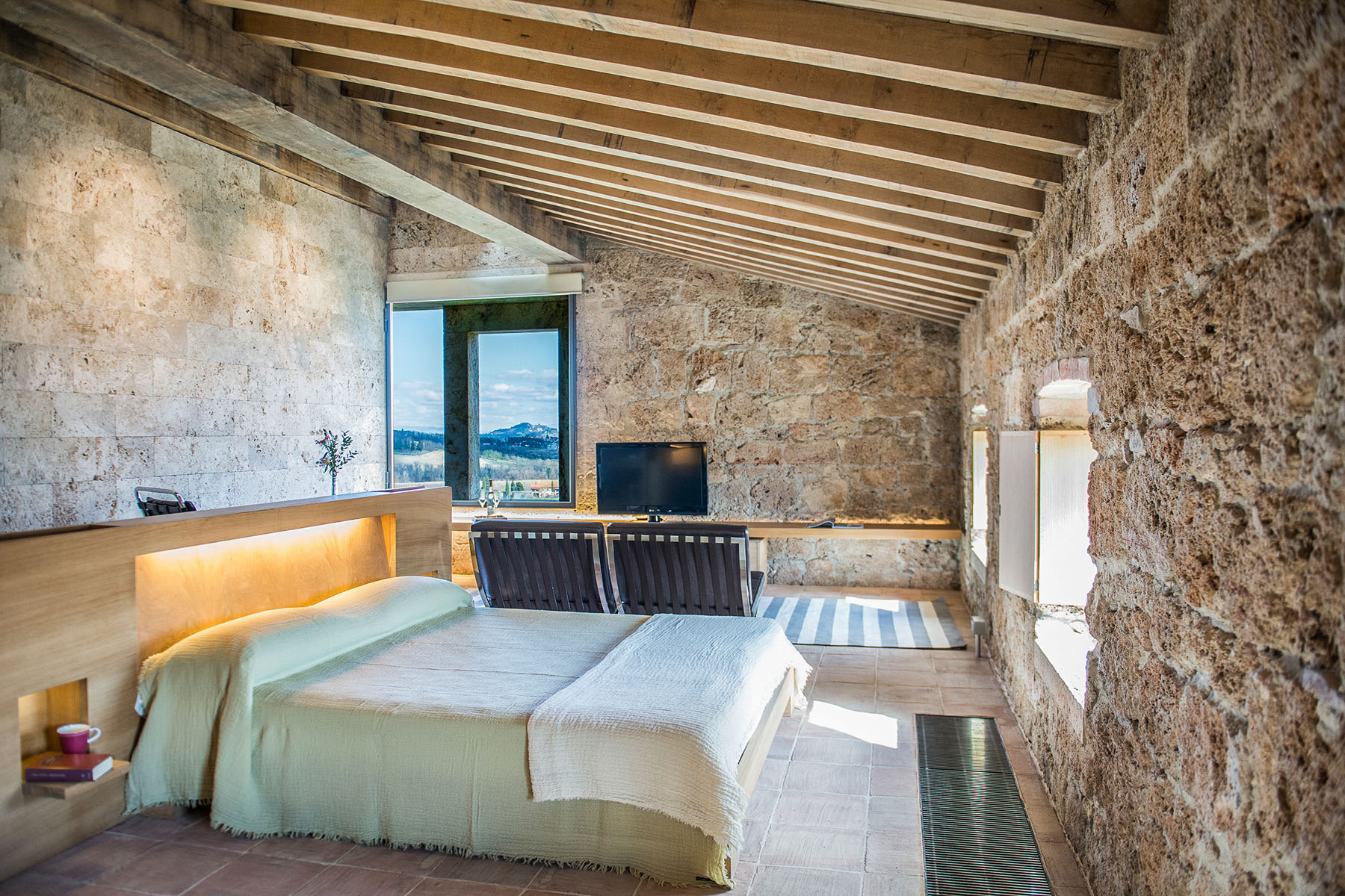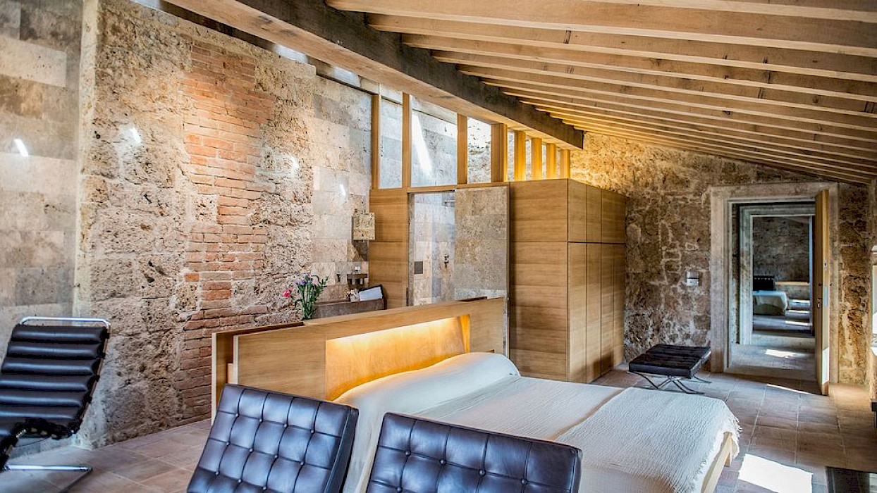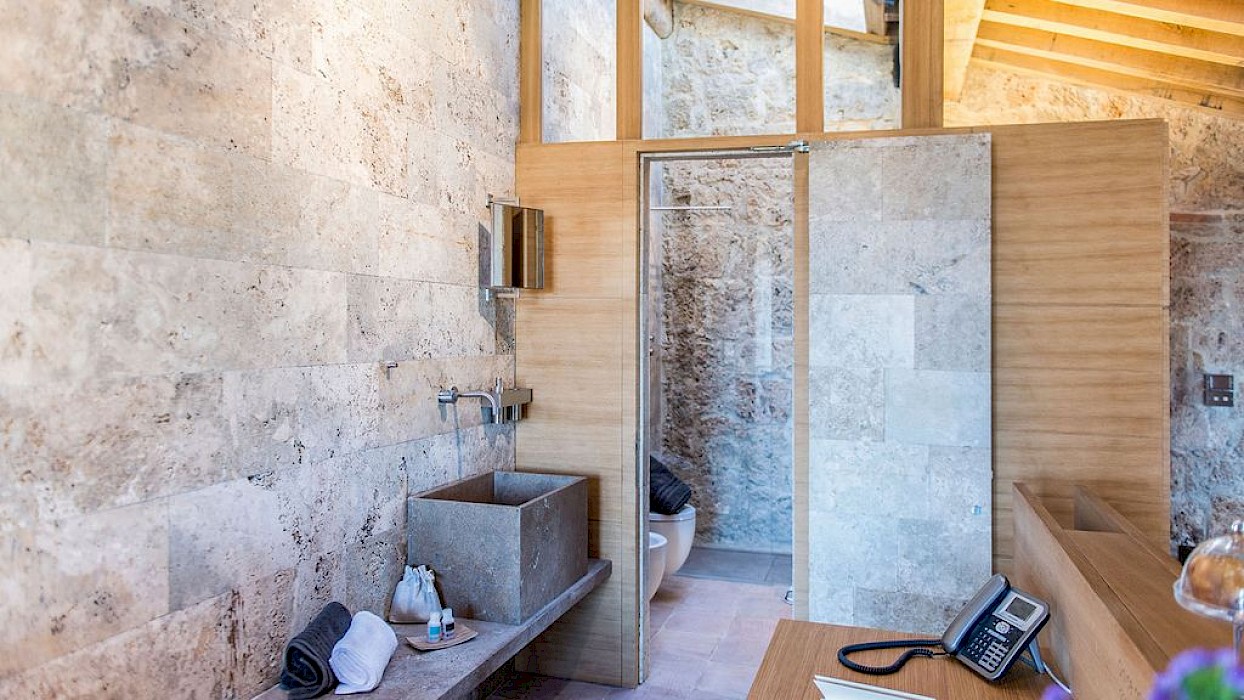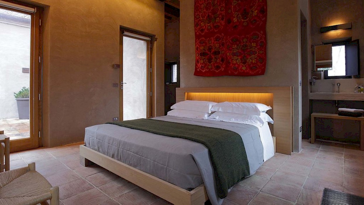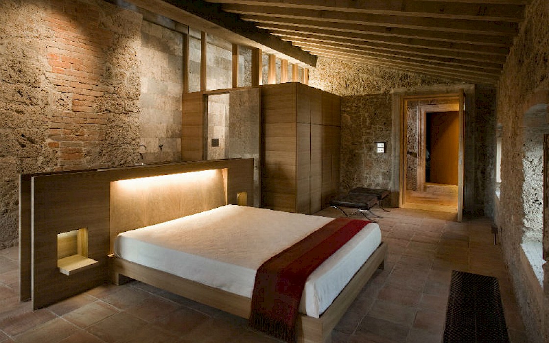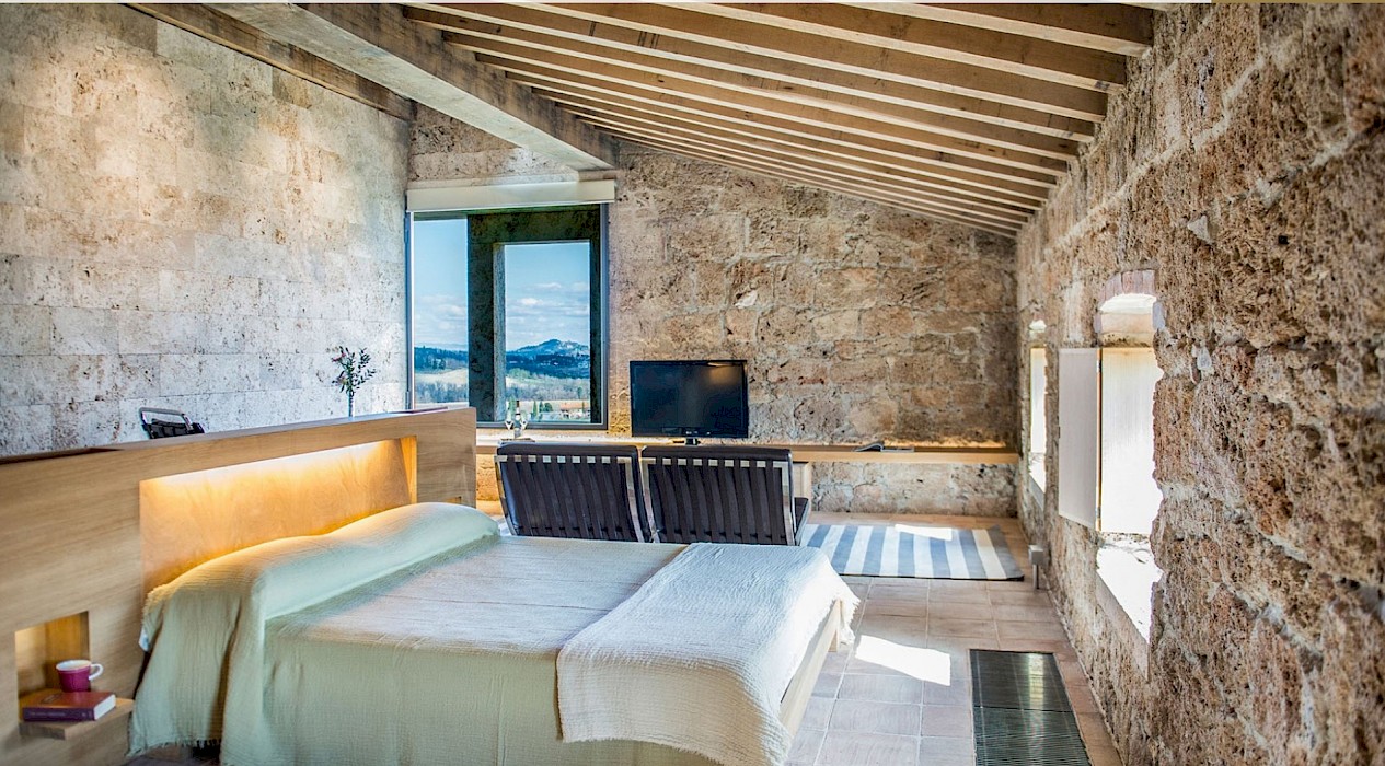 A glimpse of paradise at the end of the dirt road that leads to the villa, set on a knoll and suspended in the heart of the Tuscan countryside south of Siena, just outside the charming borgo of Sarteano, in an inimitable scenario of geometric patterns of extensive rows of vines and of a sea of olive trees that guard the property. In its centre appears the imposing structure of the 18th century farmhouse, now converted into a technologically-advanced luxury villa by architectural intervention of the highest quality. The house features exposed stone combined with wood and terracotta, in an impressive recycling of the past which has forged the present design, in which respect for local tradition combines with a fine choice of minimal and essential modernity, designed to offer guests all amenities for a perfect stay. The spacious rooms are a blaze of light, enhanced by the large windows in the living area and in the splendid bedrooms, super-equipped with private bathrooms; the furnishings, declined in the natural colours of wood, have plain and simple lines, geared to maximum functionality and efficiency. In an adjoining annex is a fitness area with a gym and a stupendous wellness room, equipped with sauna, Turkish bath and massage and treatment area (available on request). Outside, the beautiful panoramic pool, the bowling green, the cosy set-up areas and and the large green spaces will complement unforgettable days spent in the open air. This is the ideal choice for an exclusive stay in a charming, elegant residence that guarantees privacy and maximum tranquillity thanks to its secluded location and yet, at the same time, is very close to road and motorway links and is the perfect focal point, located between the southern Val di Chiana and the rough and wild Val d'Orcia, for exploring an amazing geographical region. Sarteano, with its architectural and naturalistic heritage and its impressive monuments within the old medieval town walls, is just ten minutes away but also not far away are the magnificent towns of Chiusi, Montepulciano, Pienza, Montalcino, Chianciano Terme, San Casciano dei Bagni and many other places of historical and artistic interest with their timeless charm. This prestigious property is part of an agritourism estate committed to organic farming with the best produce that Tuscany has to offer and which continues, in the modern age, to maintain the taste of authentic tradition: excellent extra-virgin olive oil and wine from autochthonous and allochthonous vines in the aromas of Sangiovese, Merlot and Cabernet which the owners will be delighted to offer for tasting in the fabulous multi-function room next to the house, along with other choice products like vinsanto (sweet white dessert wine), organic preserves and jams. Upon request, you can organize cooking lessons in the large professional kitchen or avail yourself of domestic staff and a chef for the entire stay.
