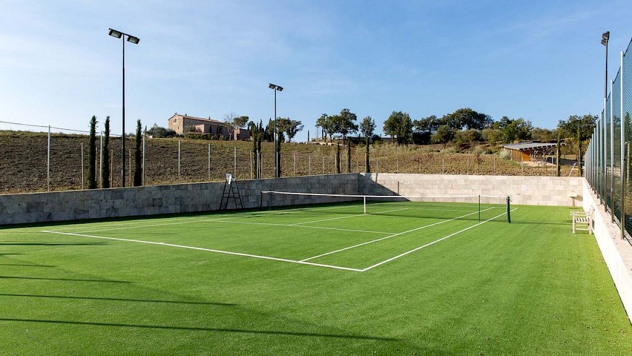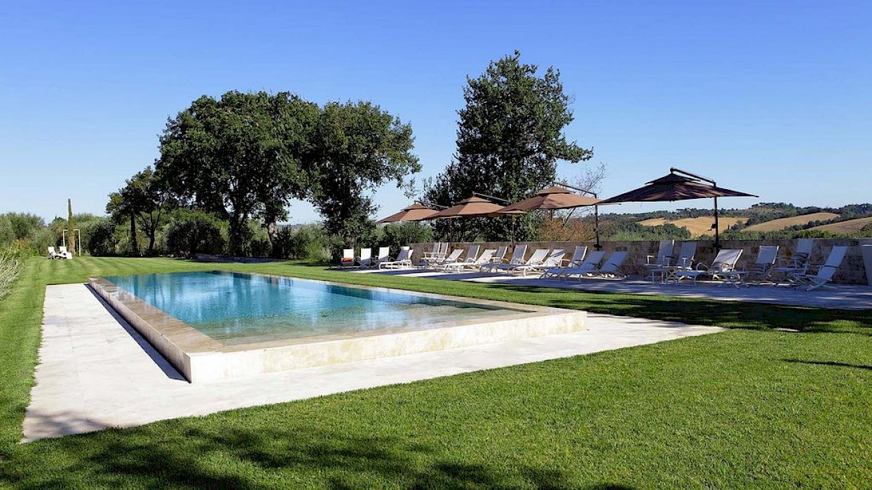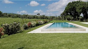 The large rectangular infinity pool is situated in the park a few metres from the house: surrounded by a garrison of olive trees and by the vineyards of the property, it enjoys open views over the hilly countryside that crowns the horizon. The border and lining of the pool, accessed via Roman steps, is in travertine stone; it measures 22 x 4.5 m with a depth varying from 1.20 m to 1.60 m. On one side is the elegant travertine-paved sunbathing area, equipped with sunbeds, deckchairs, tables, a hammock and a swing seat protected by large umbrellas. Close by is a hot and cold-water shower and down a flight of steps is a bathroom and refreshment area with minibar. A few steps away, shaded by a screen of oaks, is a regulation-size bowling green. The pool has chlorine purification and internal lighting; it is available to guests from the last Saturday of April until the first Saturday in October.
