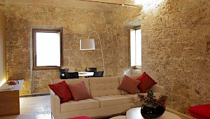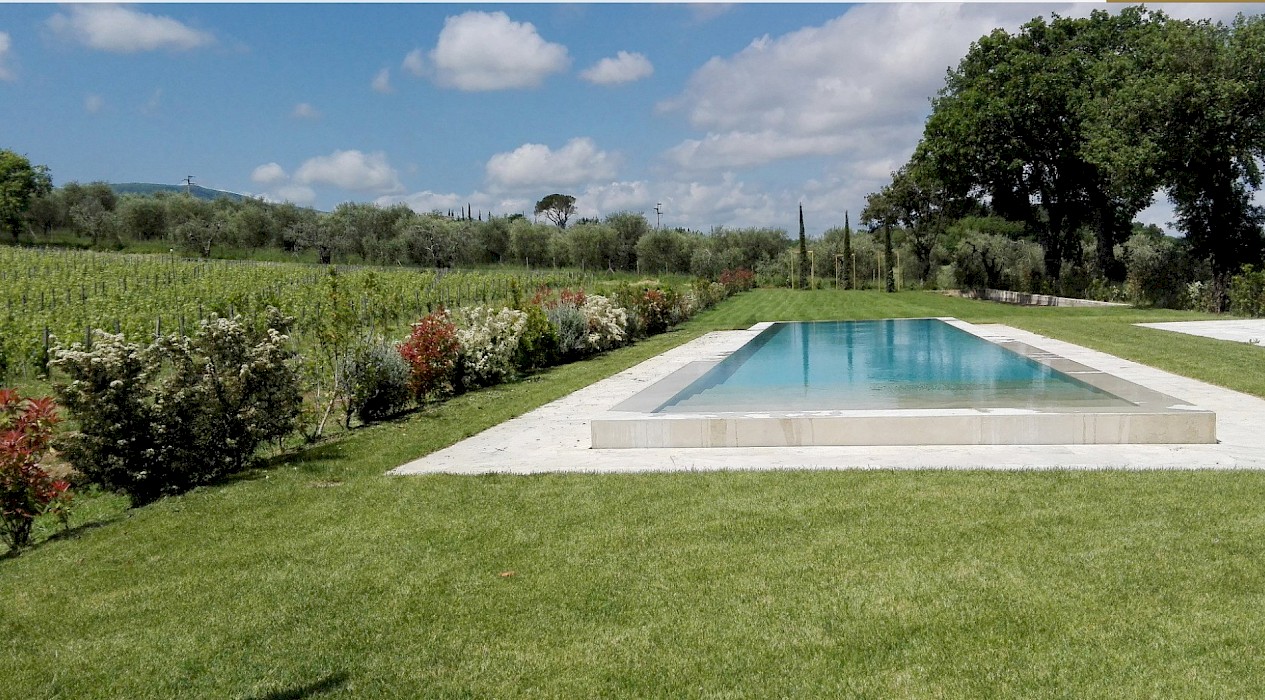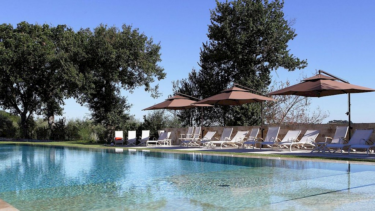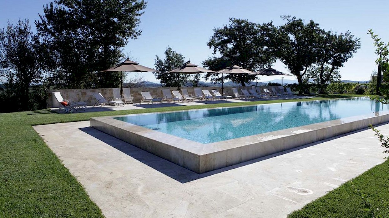 The large infinity pool made of Travertine stone, is surrounded by nature and situated between vineyard and olive groves. There is also a lounging area at the pool.