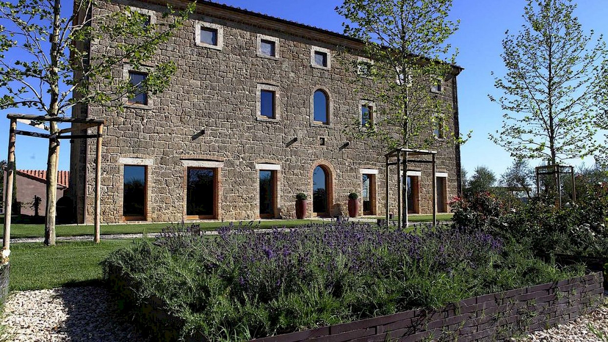 Twenty-five acres of land delimit the immense spaces of this prosperous farm where stretches of olive trees alternate with vines, an orchard and a part of arable land for organic cultivation in the centre of which lies the beautiful park with oaks and cypresses surrounding the farmhouse and bordered by bushes of herbs. In the well-cared for garden, with the typical vegetation of the area, paved paths alternate with stone steps that run along two large ornamental pools; a wonderful corner of tranquillity for the guests, with fascinating panoramic views, where they can stroll through the abundant orchard or along the dirt roads of the property, play bowls in the field near the pool or just relax comfortably in the shade of the olive trees: the ideal setting for enjoying the peaceful rural atmosphere ensured by this magical context. The covered parking area is about 150 metres from the main entrance to the house and there is also a large parking area in front of the house.