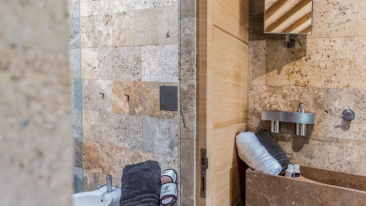 Suite 1: living room with big flat screen TV and fireplace, kitchenette, fridge, washing machine and dryer. 1 twin bedroom, 1 bathroom with shower cabin, 1 double bedroom (not convertible into a twin). Suite 2: living room with fireplace and big couch, 1 double bedroom (not convertible into a twin) with flat screen TV, en suite bathroom with shower cabin and small kitchenette with fridge. 1 double bedroom (not convertible into a twin) with en suite bathroom with double shower cabin and small kitchenette with fridge.