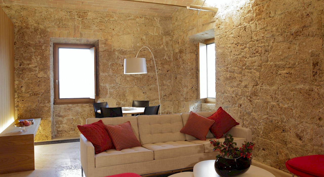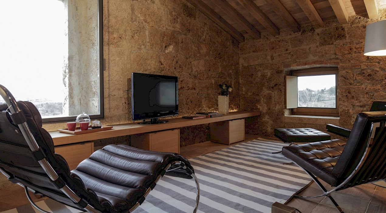 Sarteano is a picturesque medieval borgo, 600 meters above sea level, situated on high ground at the foot of Monte Cetona, in an area south of Siena straddling the attractive valleys of the Valdichiana and the Val d'Orcia, recently awarded the Bandiera Arancione (orange flag) of the Touring Club Italiano for its excellent tourism and environmental standards. It is a town of surprising charm, inserted in an area of naturalistic, historical and archaeological significance. Inside the town walls, that preserve their original medieval structure, you can visit, besides the many typical workshops, architectural gems like the churches of San Francesco and of San Martino, the collegiate church and the imposing castle, a sentinel, from atop its dominant position, of suggestive panoramic views. The archeologocial Civic Museum of Sarteano, among the most important in the province, includes many relics from the Etruscan period to the late Roman period. Also in Sarteano are some of the most important Etruscan tombs of Tuscany, including the well-preserved Tomb of the Infernal Quadriga, dating from the fourth century BC and which can be visited by appointment at the museum. About 6 km away is the town of Chiusi, with its historic town centre perched on top of a hill overlooking the Valdichiana, famous for the Etruscan remains which have been found all over its territory and now housed in the internationally important Etruscan National Archeological Museum. Famous, and open to the public, is the Labyrinth of Re Porsenna, situated under the Piazza del Duomo, in reality an old water supply system branching through intricate underground tunnels. In this magical territory the vitality of the land is substantiated through its therapeutic waters that are transformed into well-being, which you can experience at the avant-garde spa facilities of Chianciano, Bagni San Filippo, San Casciano dei Bagni, Montepulciano or Bagno Vignoni, all just a short distance from the property. Wine and food lovers can visit the nearby towns of Montepulciano and Montalcino, famous for their prestigious wines, and Pienza, where you can sample the typical cheeses. Thanks to the excellent road links the towns of Siena, Arezzo and Perugia can be reached in just under an hour.