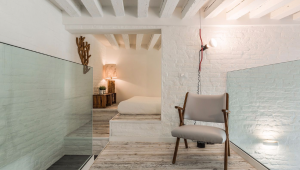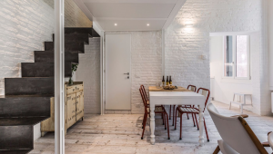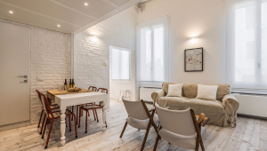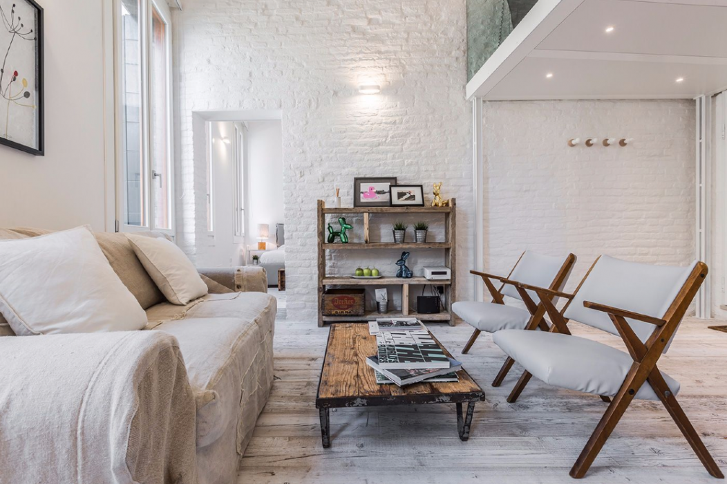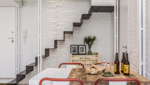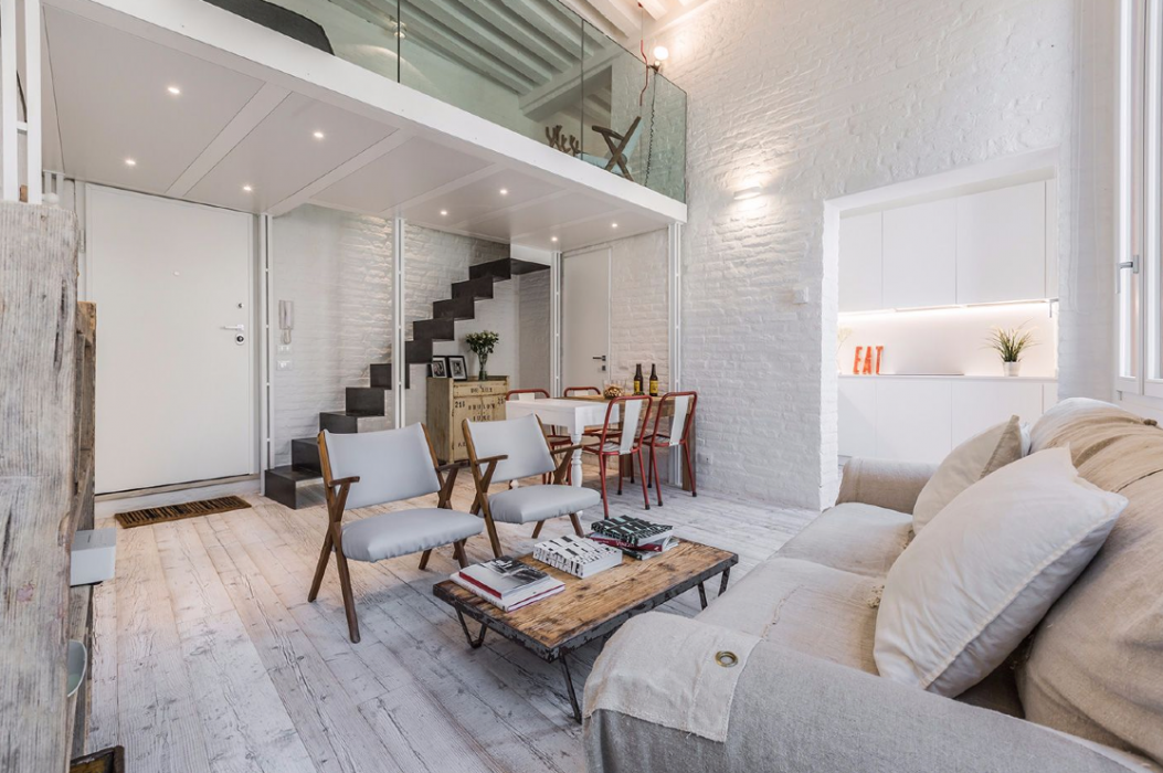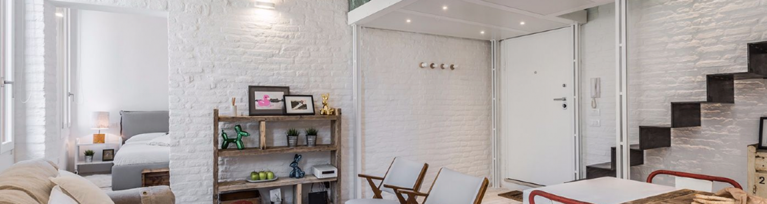 The smart lay-out of the apartment has been studied to optimize the use of the 60 square meters available: especially the mezzanine made with steel, wood and glass is a great idea to create a cozy relaxing area and most importantly to give access to the second smaller bedroom located above the living room. The style of the furniture is decidedly industrial-vintage and modern-Scandinavian. The clever use of neutral bright colors on parquet flooring, antique brick walls and wooden beamed ceilings in combination with colorful and playful interior details results in a very pleasant environment, appealing especially to contemporary art lovers.