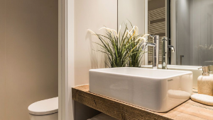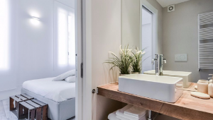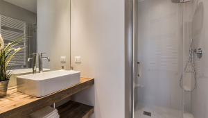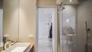 A special mention goes to the luxury bathrooms: the extra-large tiles give the feeling of a continuous surface interrupted only by elegant vanities and natural wood used for the counter tops, while the large mirrors reflect the minimal glass wall of the showers.