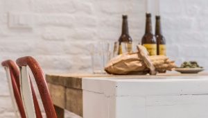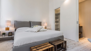 It is composed of a generous size living room equipped with a comfortable sofa, some Danish design chairs from mid-20th century and a rustic table for four people, a stunning and very functional designer kitchen, a cozy double bedroom with walk-in wardrobe and en-suite bathroom, a second small bedroom accessible from the mezzanine in the living room and a second bathroom with shower. Please note that the smaller bedroom is reached through a staircase, has 1,5 meter high ceilings and is open on the mezzanine (there isn’t a door).