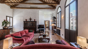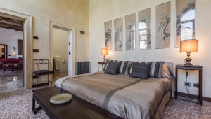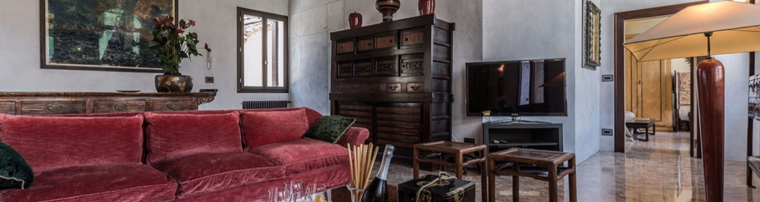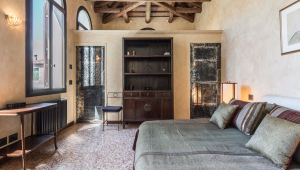 The uniqueness of this property is witnessed also by sophisticated Japanese style furniture, very comfortable sofas upholstered with soft and precious Oriental textiles, refined interior details and artworks, high-tech appliances. There is an antique foldable dining table that can be extended for up to 8 people, a luxurious kitchen with top-of-the-line appliances and a truly venetian gothic shaped window.