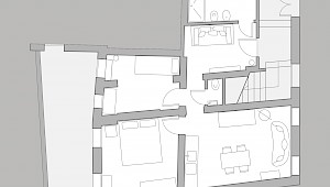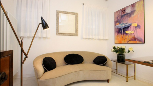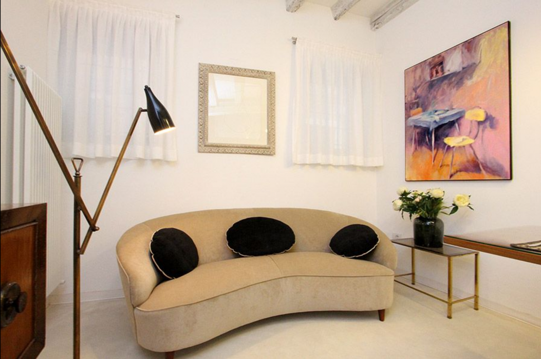 This apartment is furnished with some interesting designer pieces and modern antiques, the color palette is soft but warm, the flooring is particularly interesting as a result of the use of ribbed concrete material.