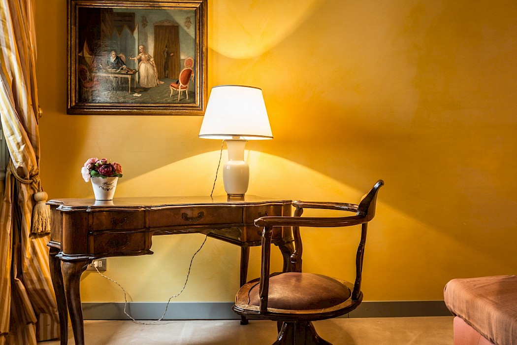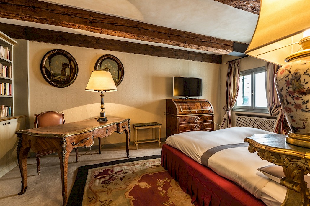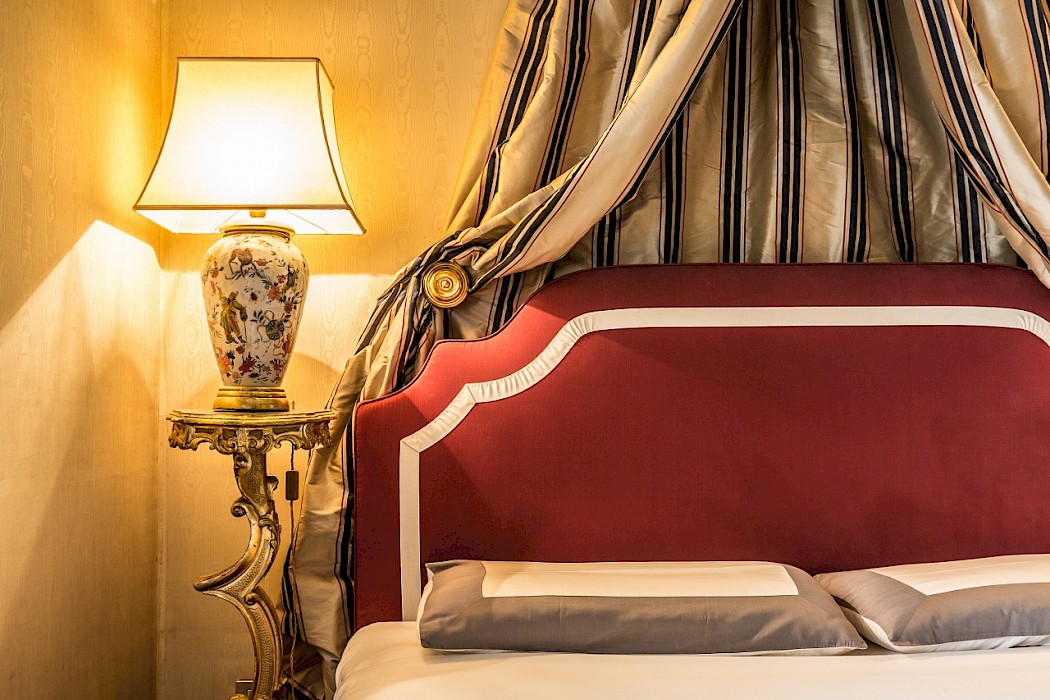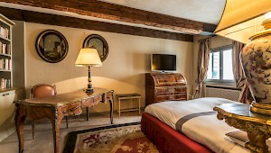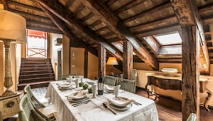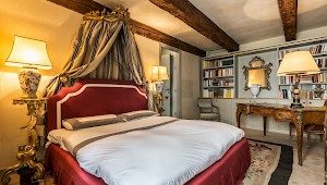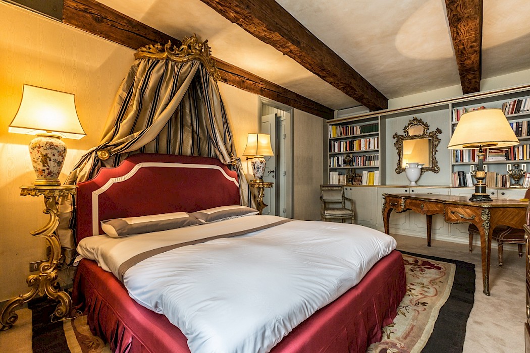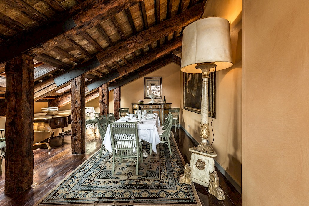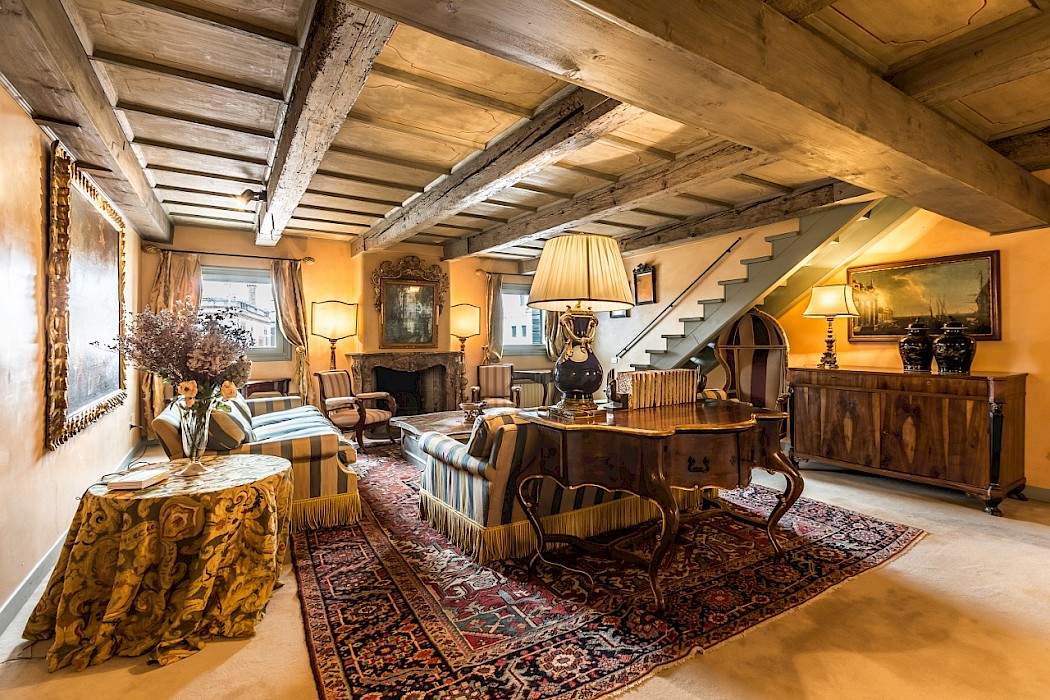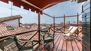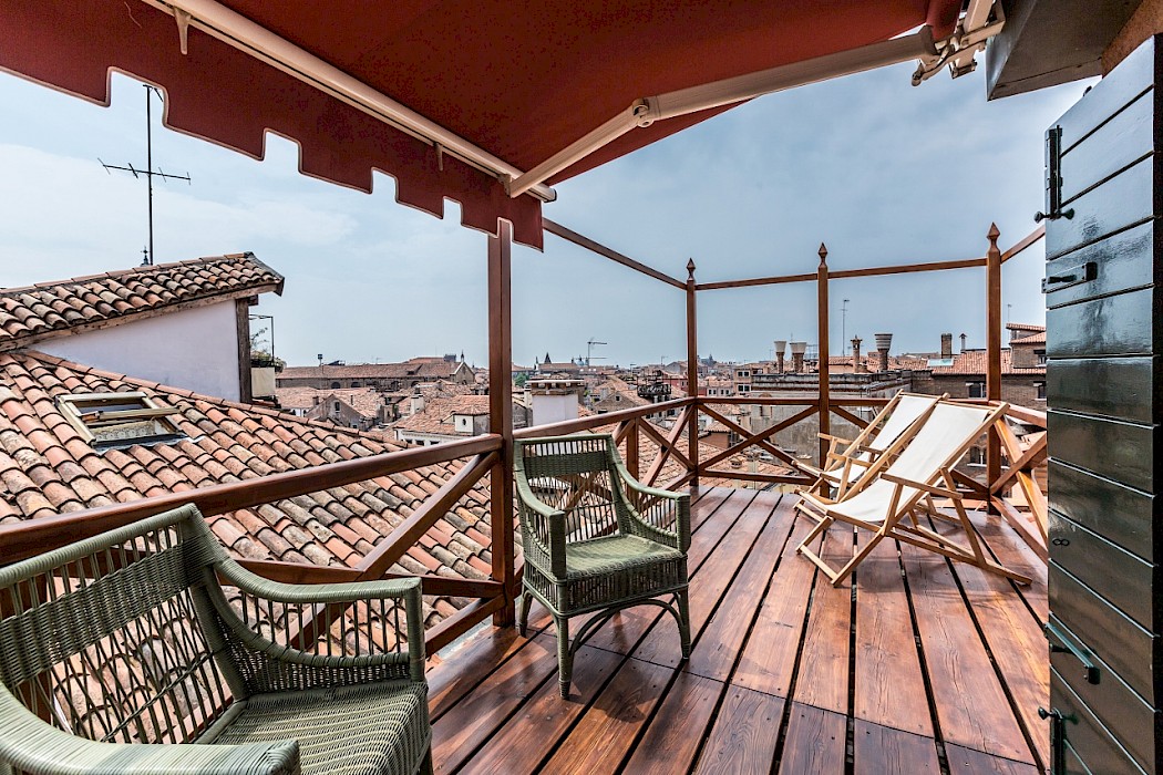 This fantastic penthouse apartment is on the fourth floor of an antique palace in the San Marco Quarter. It features two double bedrooms and Two full bathrooms, exquisite furniture and a lovely terrace and dining room on the top floor. The penthouse faces all sides of the palace and is furnished with central air conditioning, Wi-fi and all modern facilities. The Large and bright living room can seat 8 people, and the dining room has seating for 8 as well. The terrace is equipped with armchairs and a table where you can dine and sunbathe. This is the second living room for about 7 months a year. The bedrooms have queen size beds and the gold canopies with the exquisite 17th and 18th century furniture give a character to the rooms that is unique.