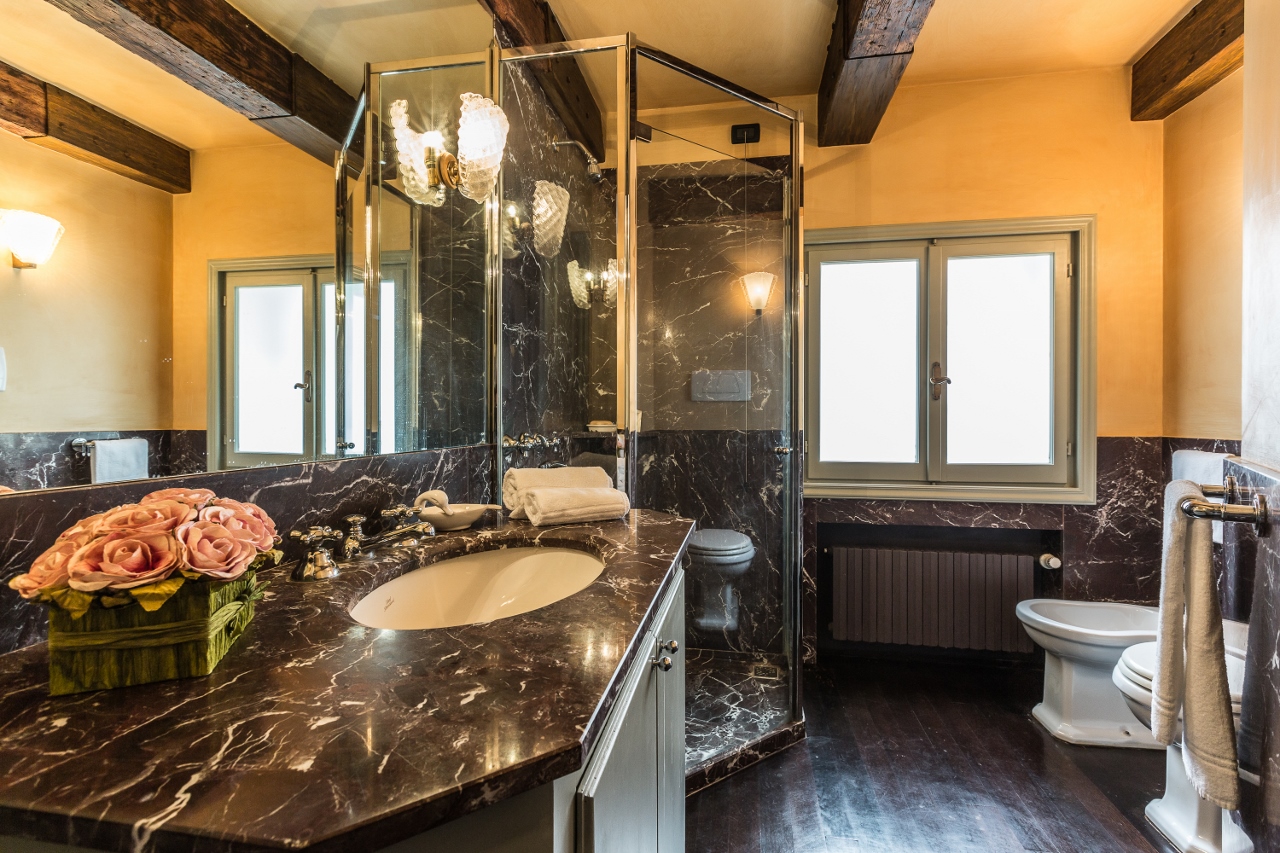 The bathrooms are in marble and the kitchen is fully equipped for professional cooks. The apartment can be reached via stairs or an elevator and the proximity with the Sant’Angelo vaporetto is extremely convenient for Alilaguna Airport shuttle boat and vaporetto Line 1.