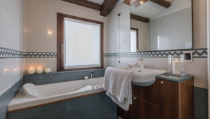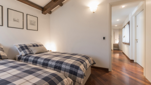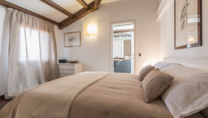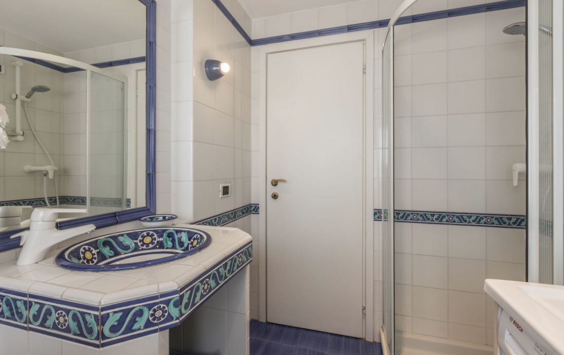 A long corridor connects the living area with the three bedrooms: the master bedroom and the second bedroom are furnished with a king size bed, wardrobe and an en-suite bathroom with shower;  the third bedroom, that can be set-up with 2 single beds or as a double on request, has access to the third bathroom with bathtub.