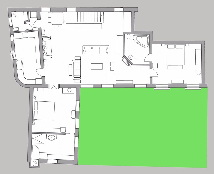 The most remarkable part of the apartment, in our opinion, are the two king size bedrooms with en-suite bathrooms, located at opposite sides of the living room to guarantee total privacy, both with pleasant garden views and plenty of natural light. The bathroom with the shower features an antique stone wash-basin which you can’t find anywhere else.